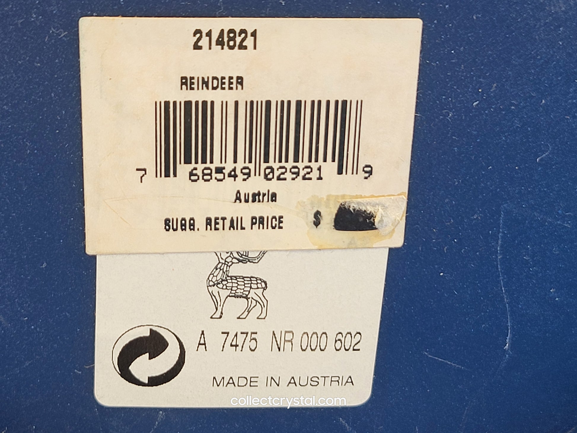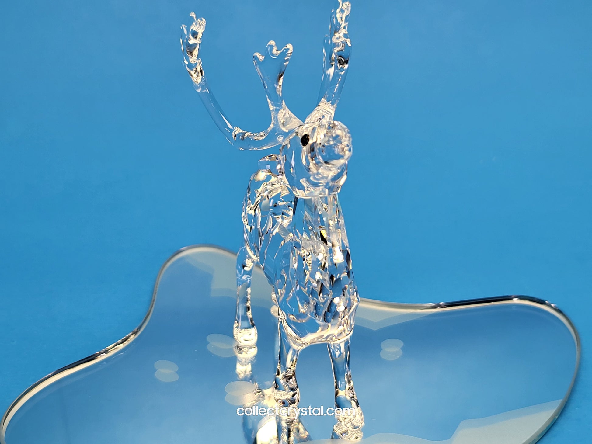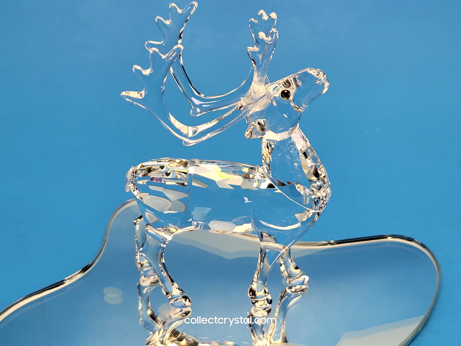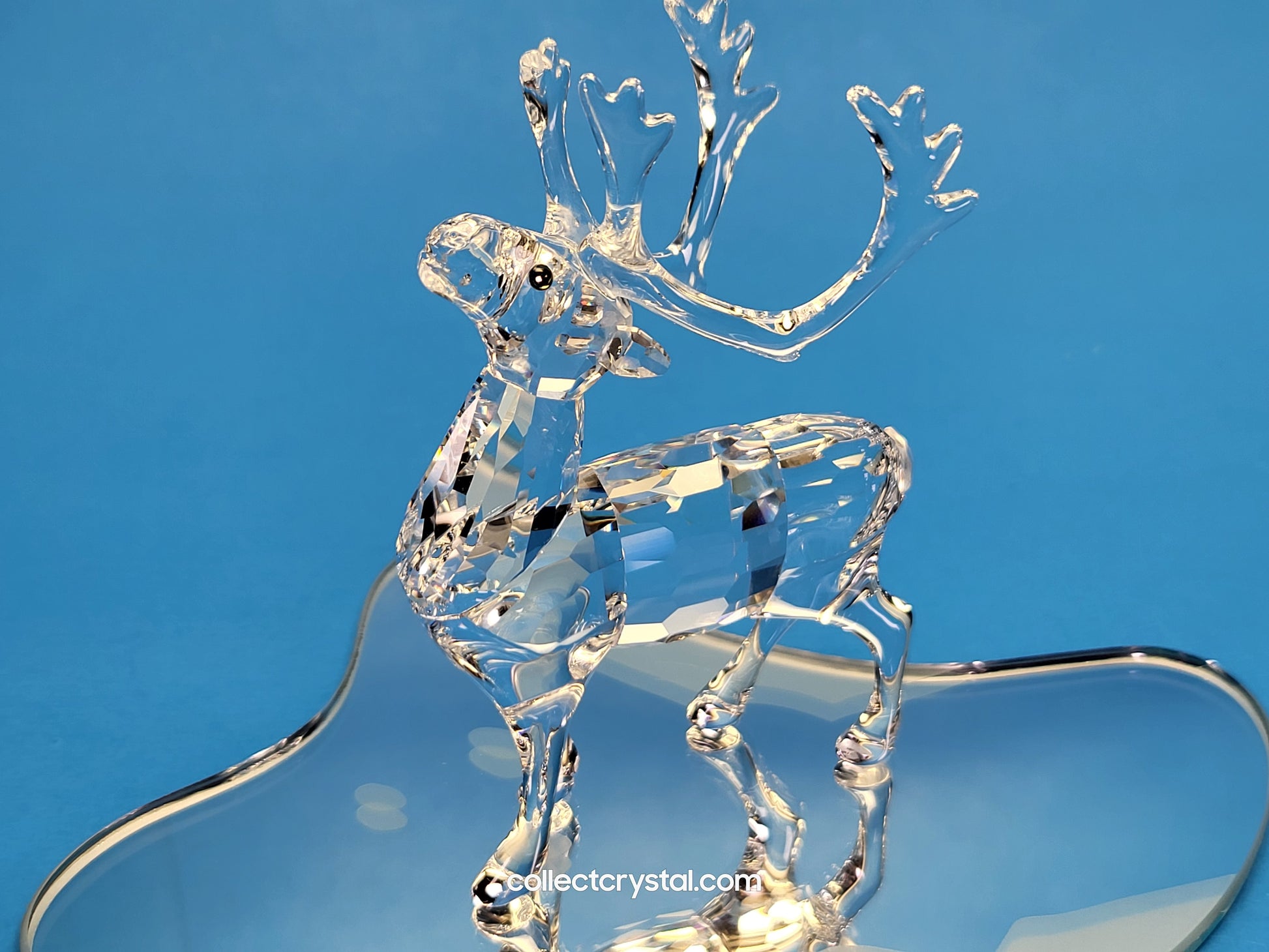This retired Swarovski crystal reindeer comes complete with a display mirror with reindeer footprints on. Made from clear crystal, the reindeer was part of the “Exquisite Accents” group. Here at The Crystal Lodge, we have noticed that the positioning of the antlers can vary from being wide apart to quite close set.