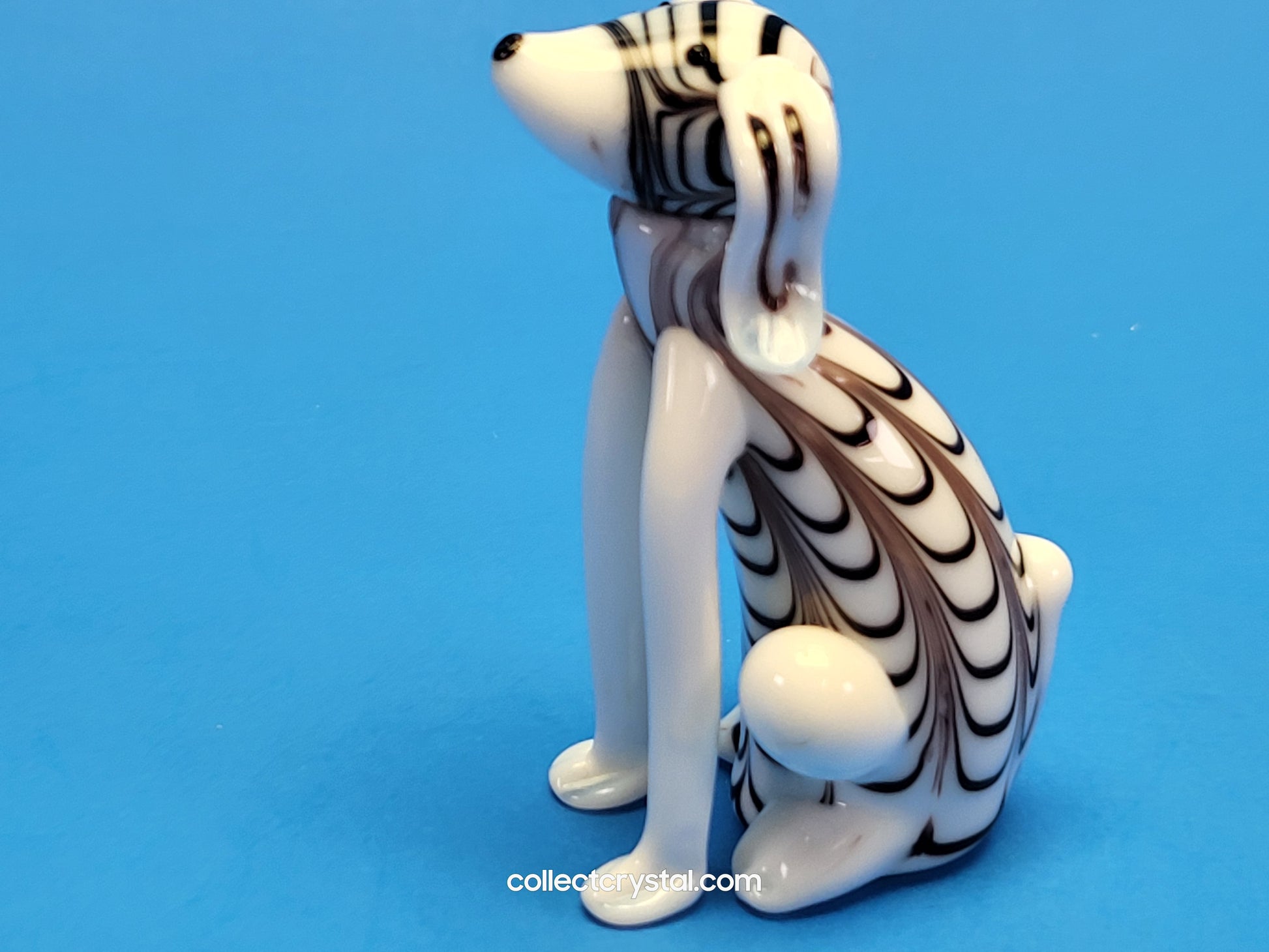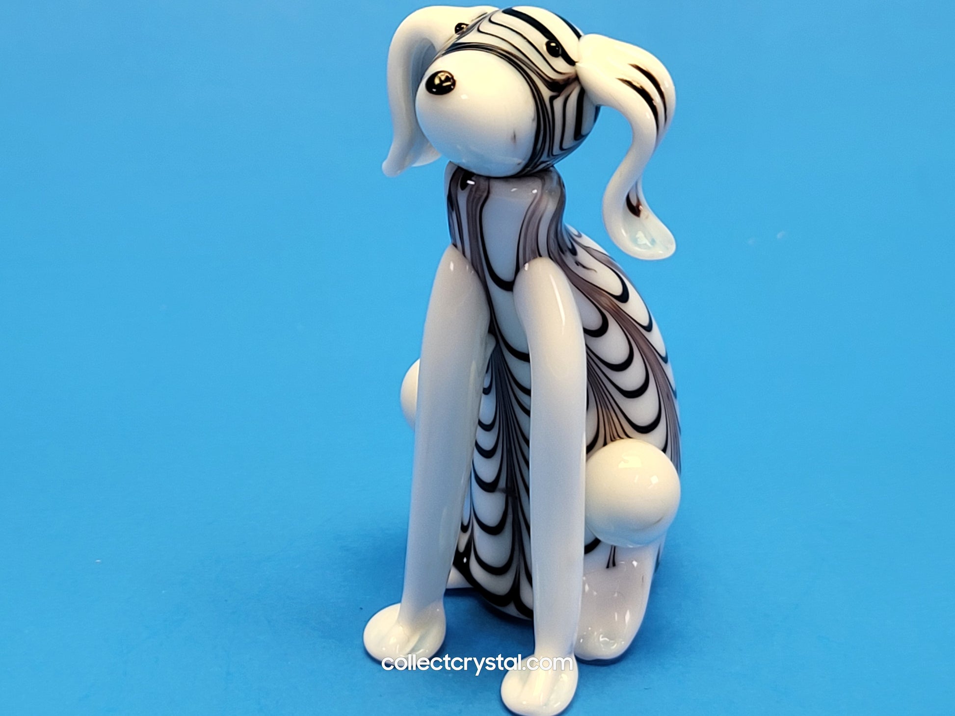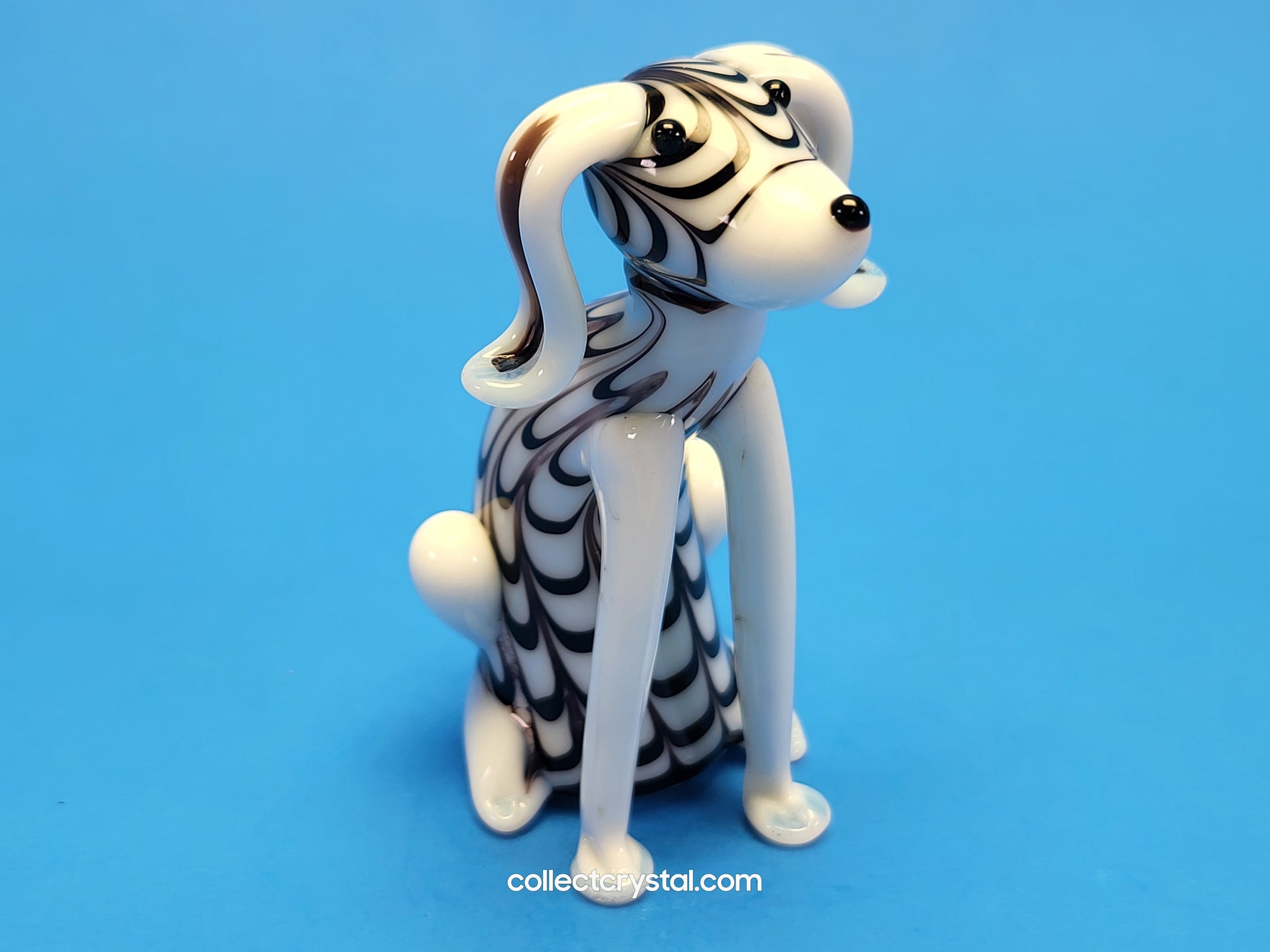 This hand-blown glass figurine captures a charming black and white puppy in exquisite detail, standing 5 inches tall. Each piece is individually crafted using traditional glassblowing techniques, ensuring unique variations in color and pattern. The contrasting monochromatic design highlights the artisan's skill, while the smooth, polished surface showcases the clarity and quality of the glass. Perfect for collectors, this delicate sculpture makes an elegant display piece or thoughtful gift for dog enthusiasts and art lovers alike.