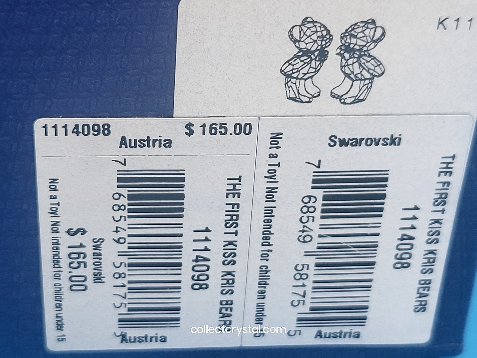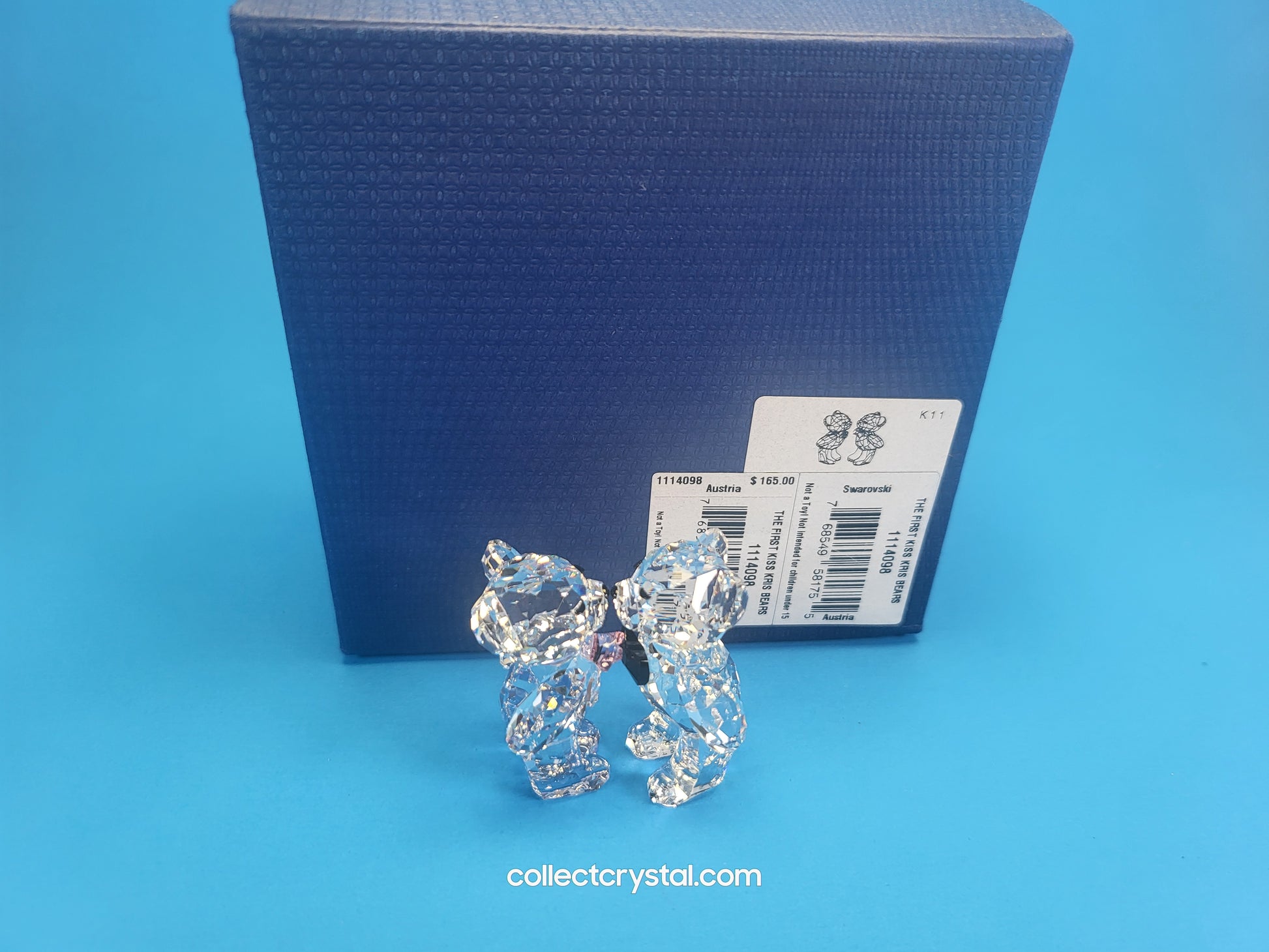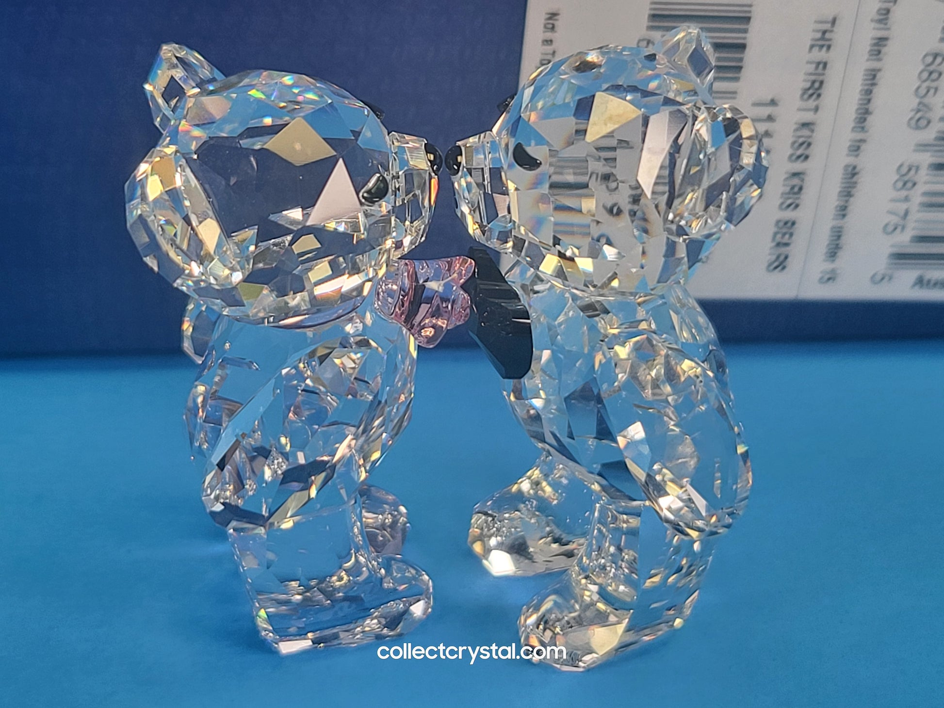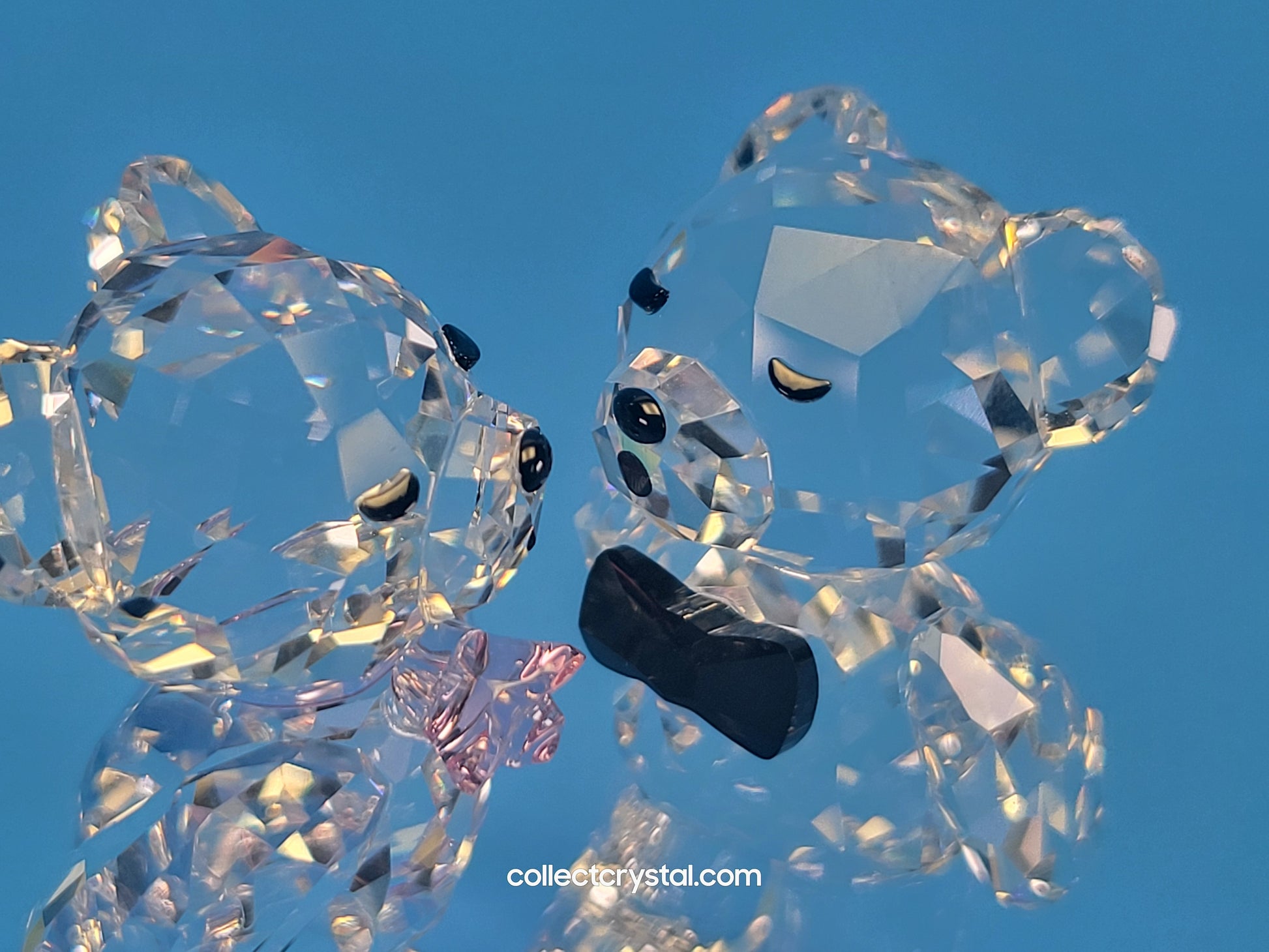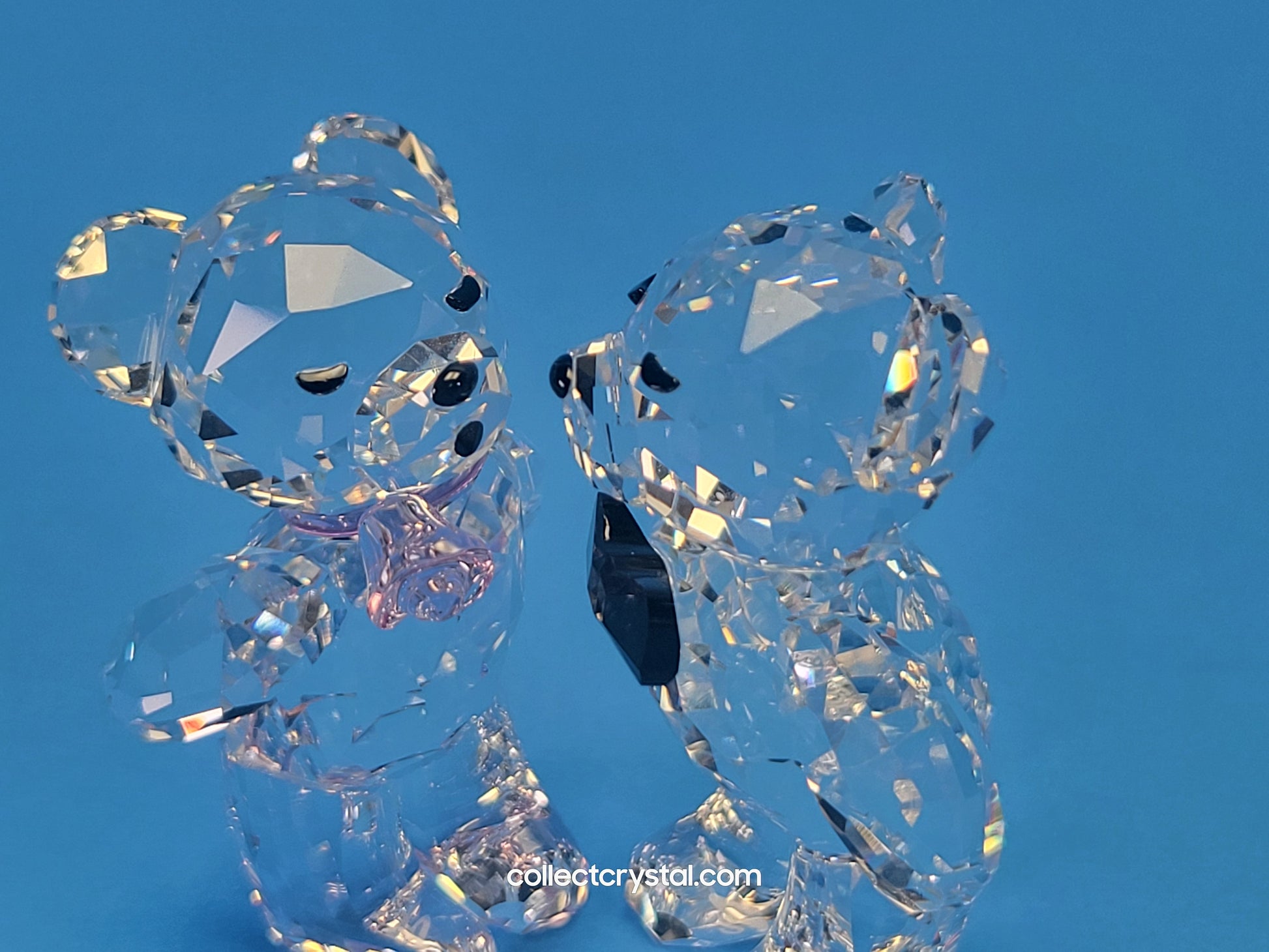 These Swarovski crystal Kris Bears are called “The First Kiss”. This heart-warming pair of Kris Bears is about to kiss for the first time! The Kris Bear boy wears a bow tie in Jet crystal, while the Kris Bear girl’s pretty necklace shines in Rose crystal. Both sparkle in clear crystal with a printed mouth and Jet crystal nose. An ideal gift or wedding cake topper!