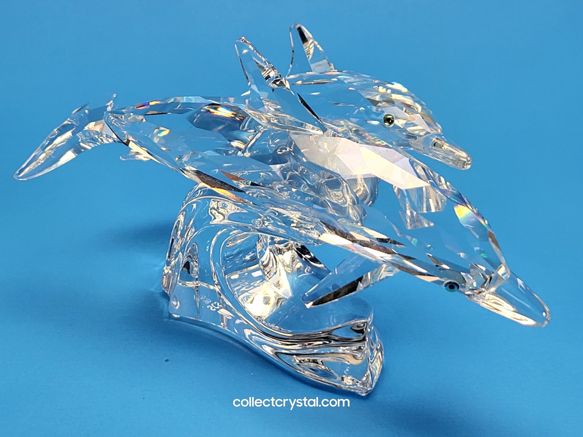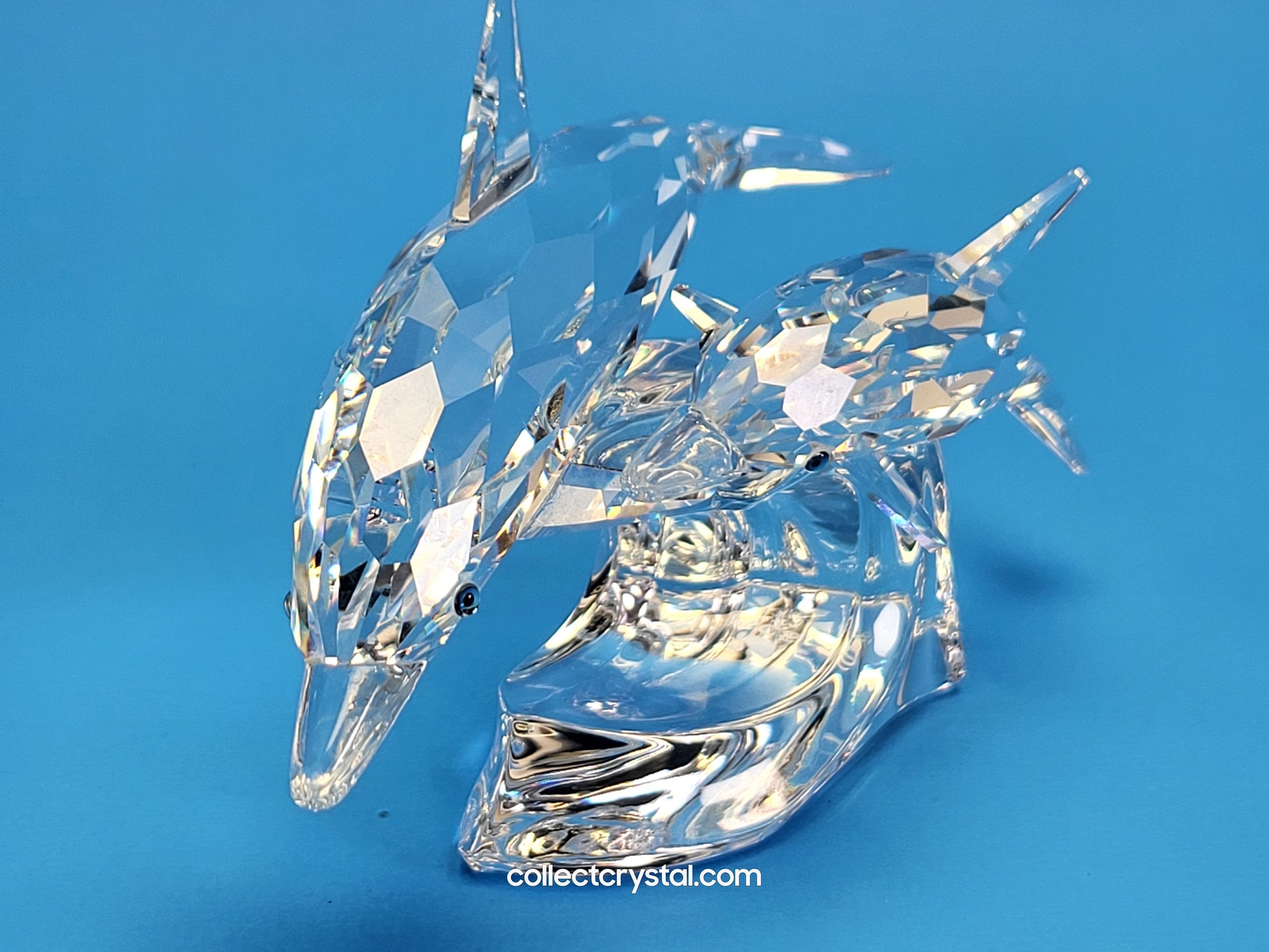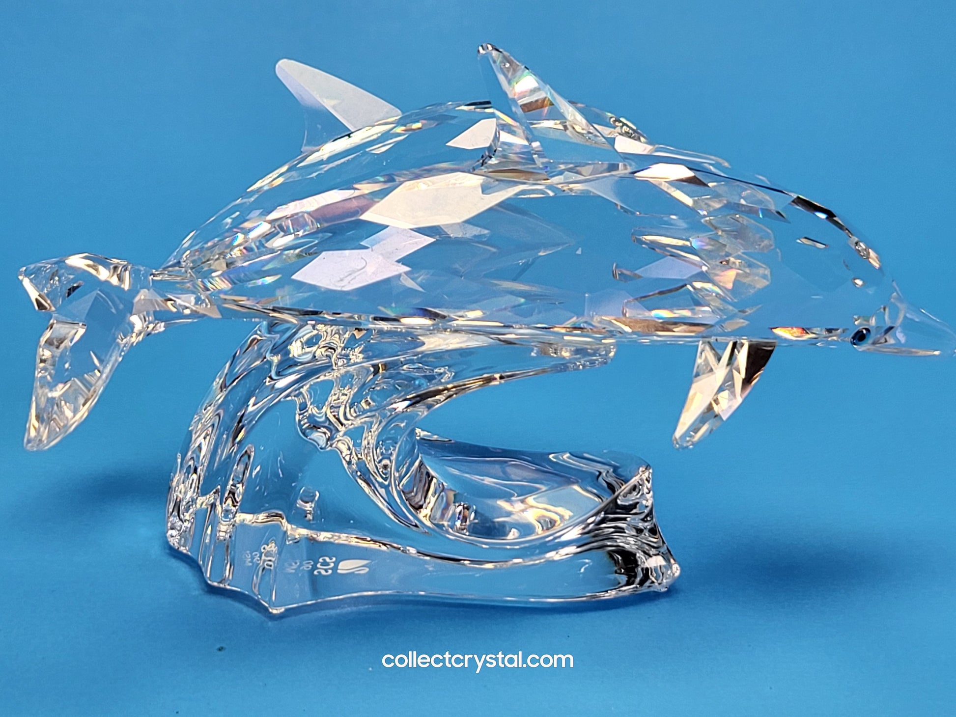 First piece in the Mother and Child Trilogy, this edition features an optical illusion in the crystal, namely, by using straight facets to give the impression of something round. Fully cut crystal dolphins on molded crystal wave base.