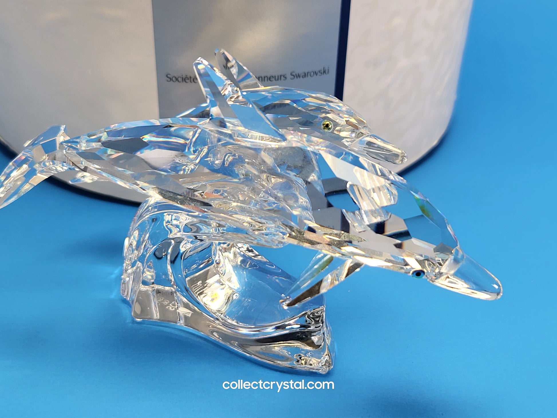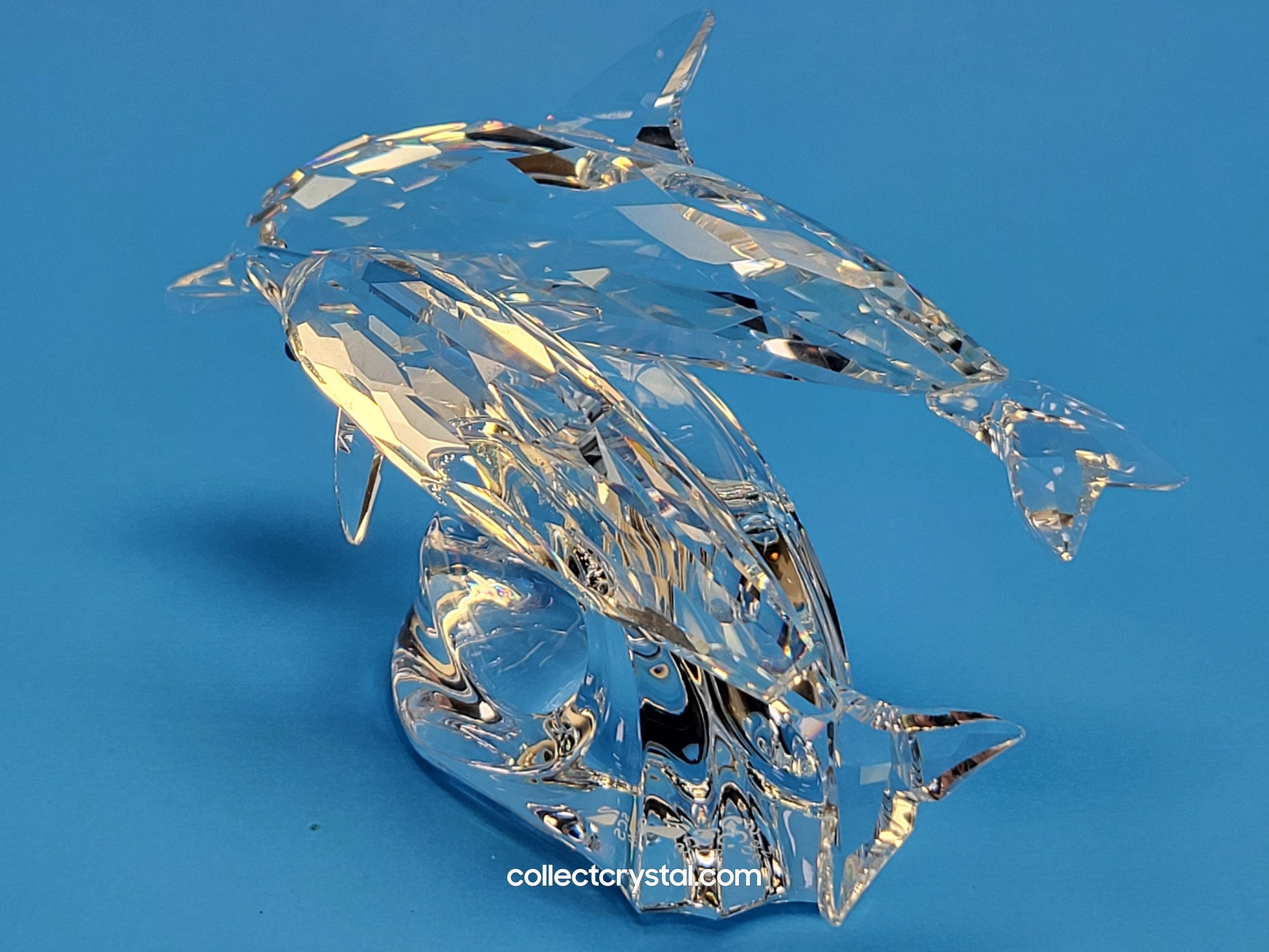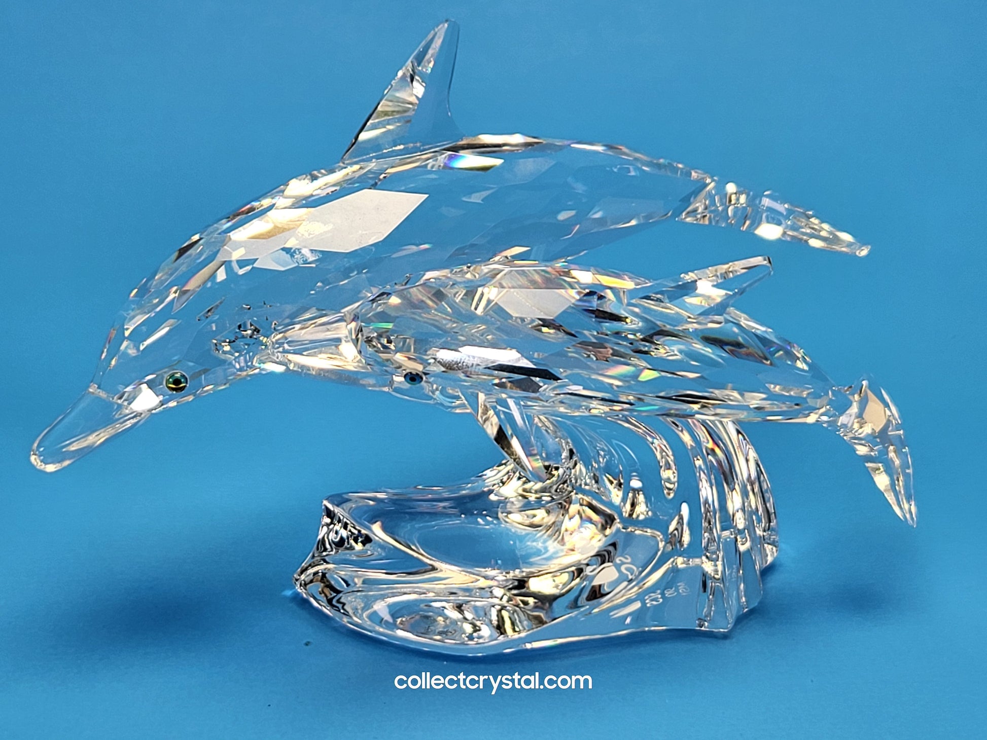 First piece in the Mother and Child Trilogy, this edition features an optical illusion in the crystal, namely, by using straight facets to give the impression of something round. Fully cut crystal dolphins on molded crystal wave base.