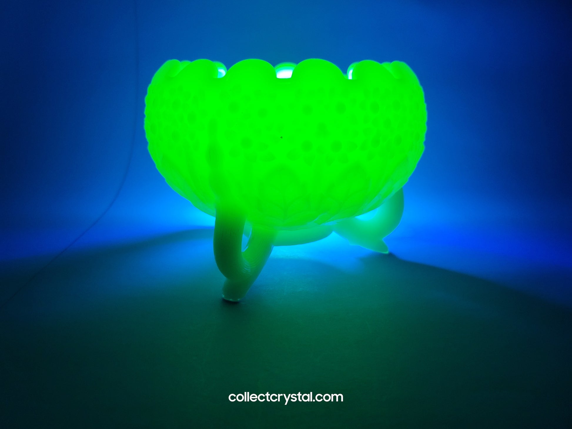 Fenton's custard satin uranium glass footed bowl showcases the distinctive pale yellow hue characteristic of Depression-era glassware. The ruffled rim adds elegant dimension to this versatile piece, suitable for displaying candy, serving small portions, or as a standalone collectible. Hand-finished with Fenton's signature craftsmanship, the footed base provides stability while the satin finish creates a soft, refined appearance. A notable example of mid-century American glassware production, this bowl appeals to both functional users and serious collectors of vintage Fenton pieces.