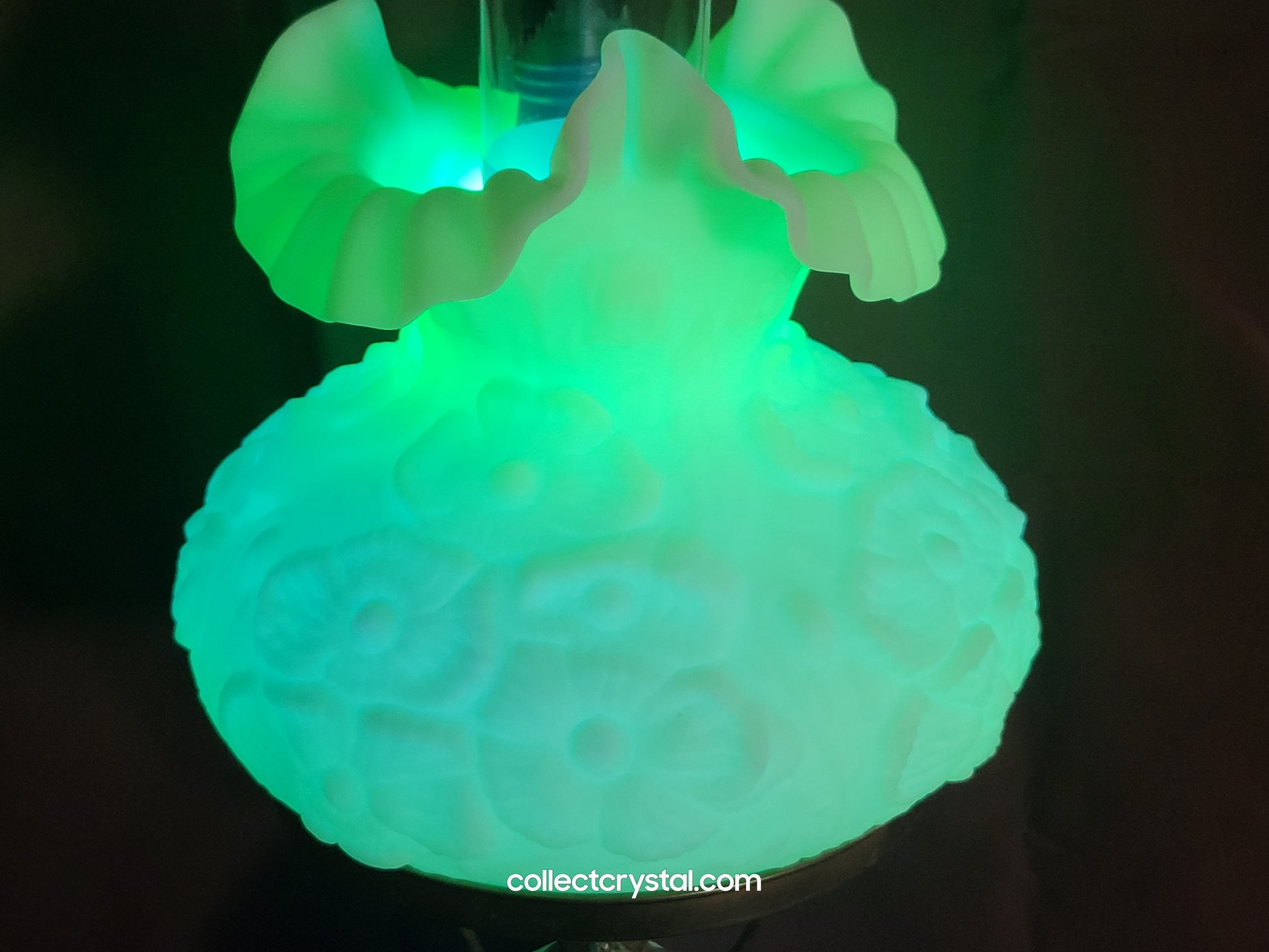 Fenton's uranium custard glass student lamp exemplifies mid-century lighting design with its distinctive poppy motif and luminous yellow-green hue. Standing 20 inches tall, this piece features a substantial marble base that provides stability and elegant contrast to the glowing glass shade. The uranium glass exhibits characteristic fluorescence under UV light, making it both a functional desk lamp and a prized collectible. Ideal for vintage enthusiasts and serious glass collectors seeking authentic Fenton artistry.