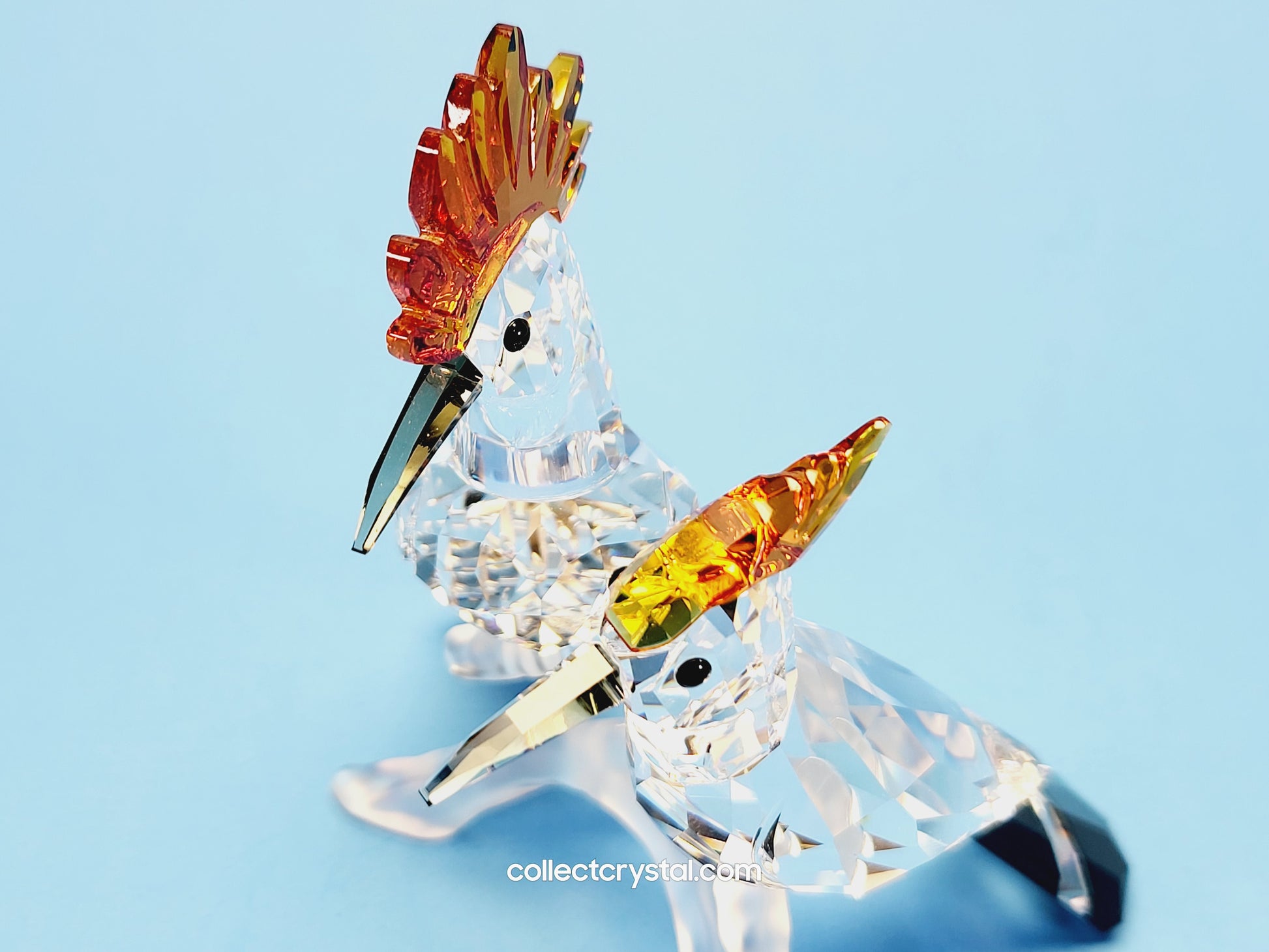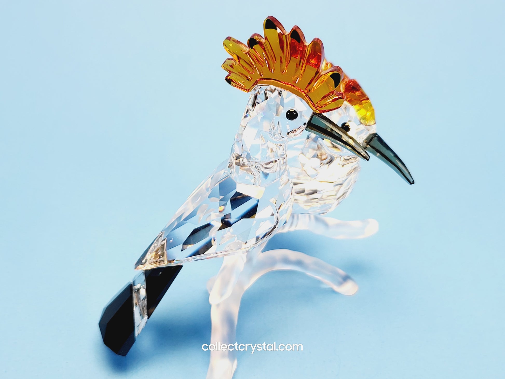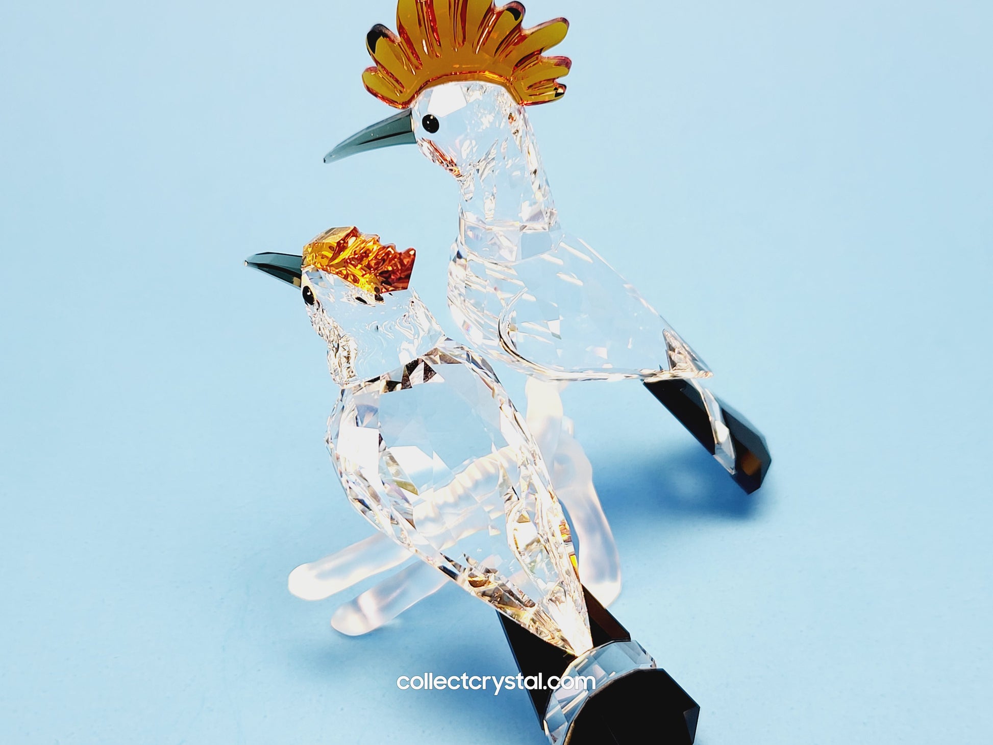 These retired Swarovski crystal Hoopoes were part of the “Feathered Beauties” collection. Hoopoes are funny, colourful birds known for their distinctive crown of feathers. These two fully faceted clear crystal hoopoes have Black Diamond crystal beaks. Their crown is in Medium Topaz crystal and the tails are in Jet and clear crystal. They are perched on an unfaceted clear crystal branch base.