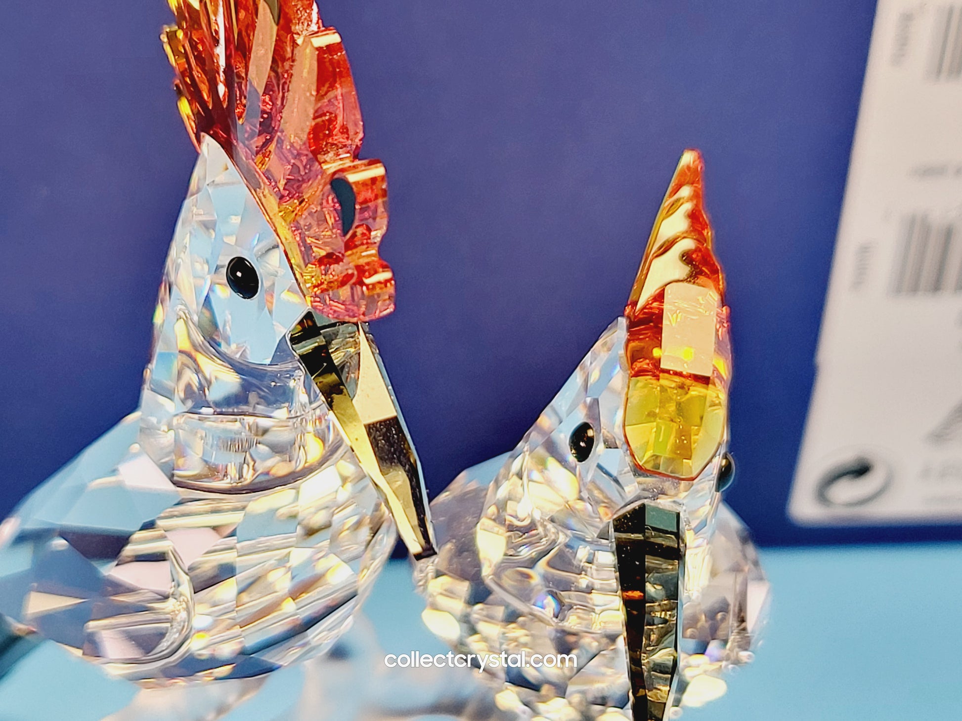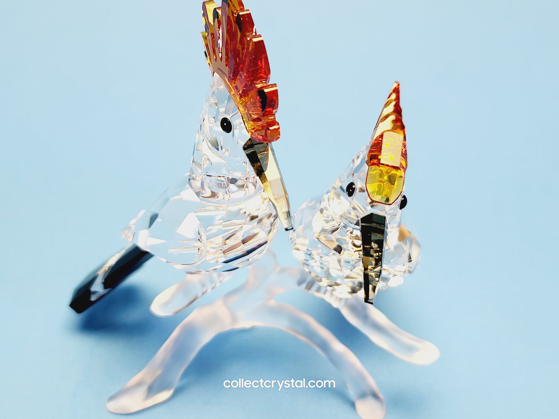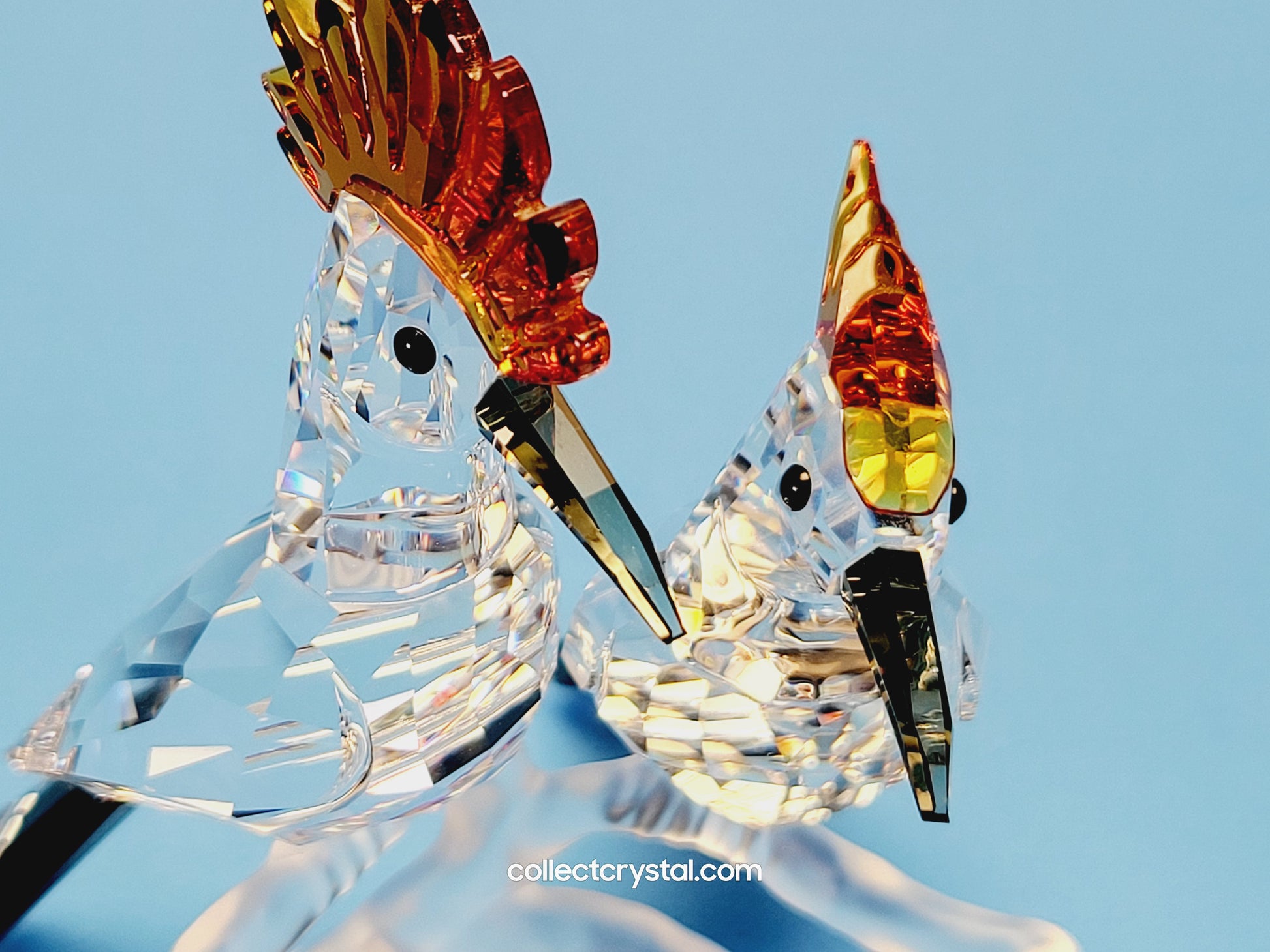 These retired Swarovski crystal Hoopoes were part of the “Feathered Beauties” collection. Hoopoes are funny, colourful birds known for their distinctive crown of feathers. These two fully faceted clear crystal hoopoes have Black Diamond crystal beaks. Their crown is in Medium Topaz crystal and the tails are in Jet and clear crystal. They are perched on an unfaceted clear crystal branch base.
