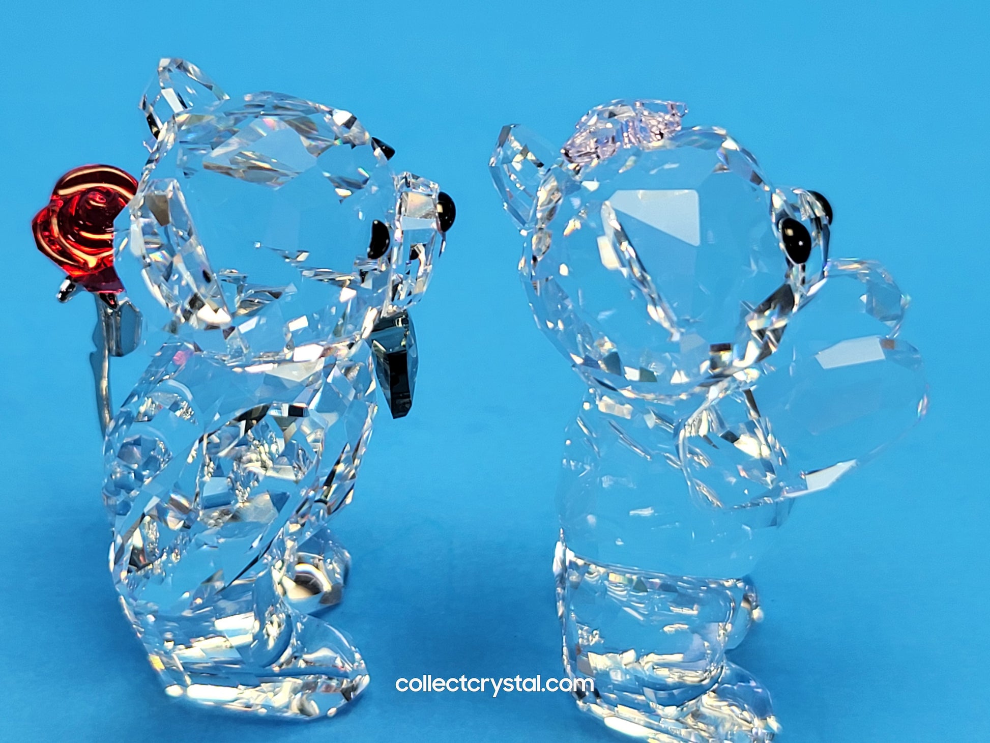 This adorably expressive Kris Bear couple would make an ideal Valentine’s Day, wedding or anniversary gift or a lovely addition to your own collection. Sparkling in clear crystal with black crystal eyes and printed mouths, one wears a pink crystal bow on its head, while the other wears a black crystal bowtie and holds a red crystal rose on a polished metal stem.