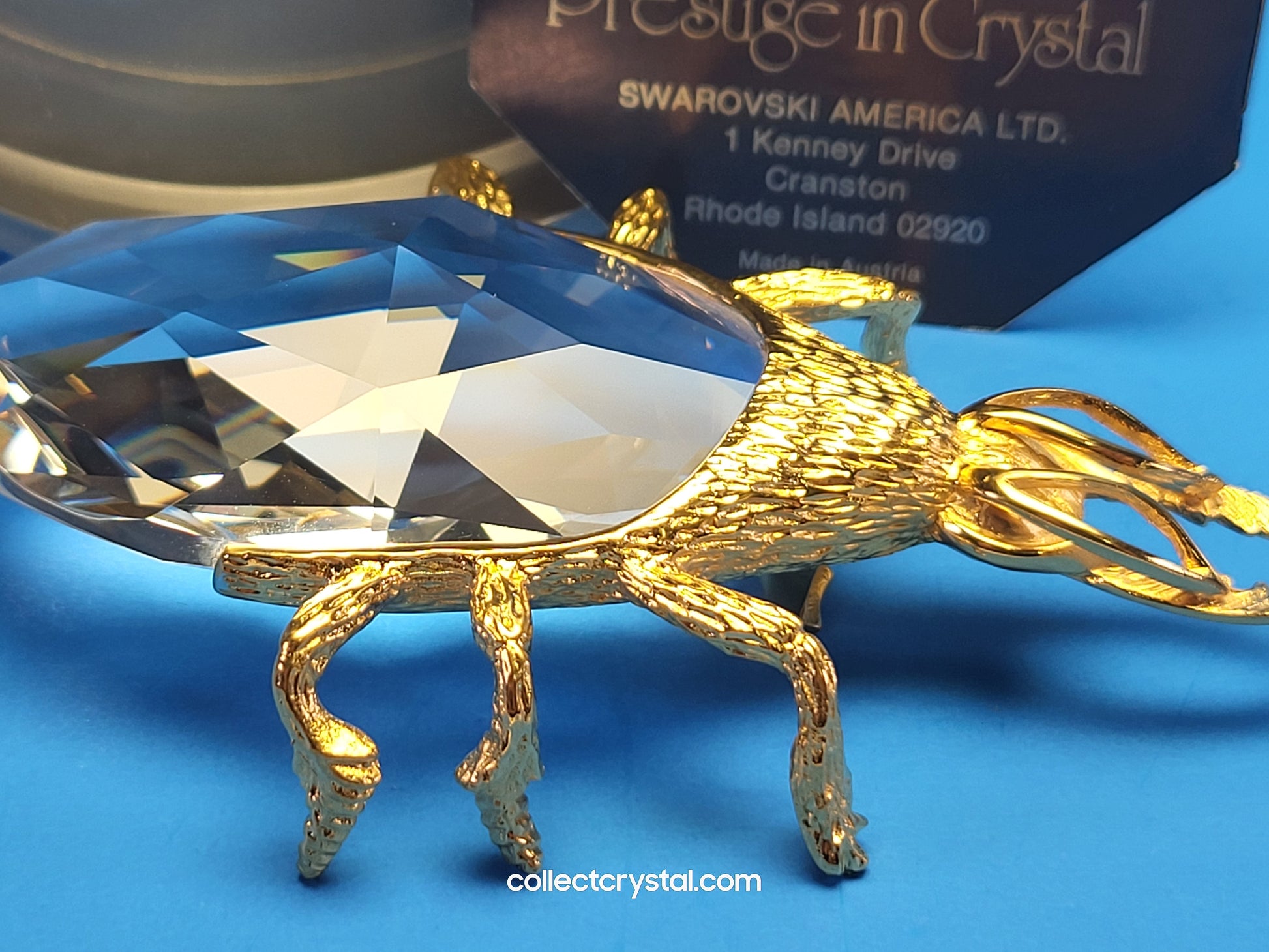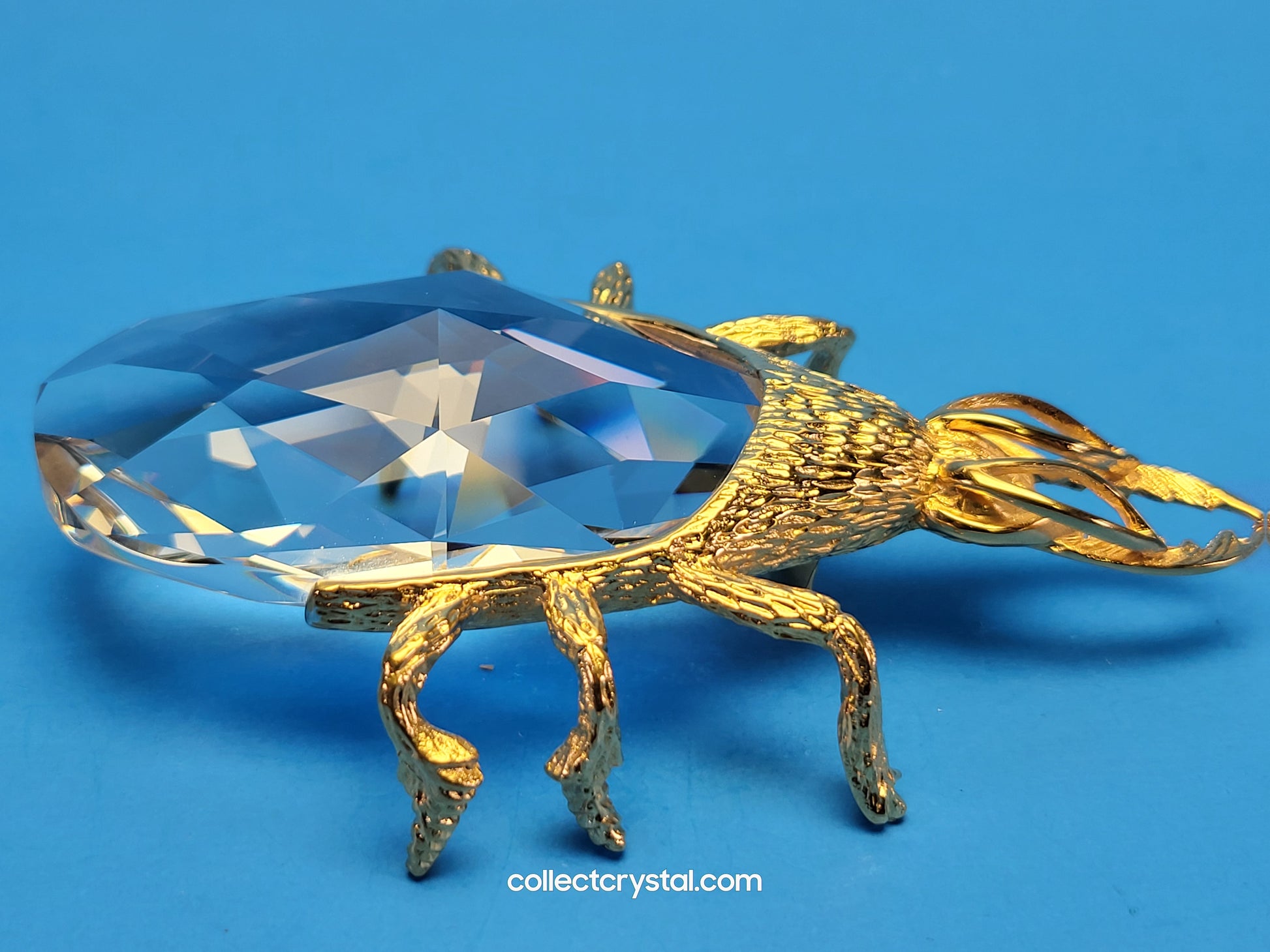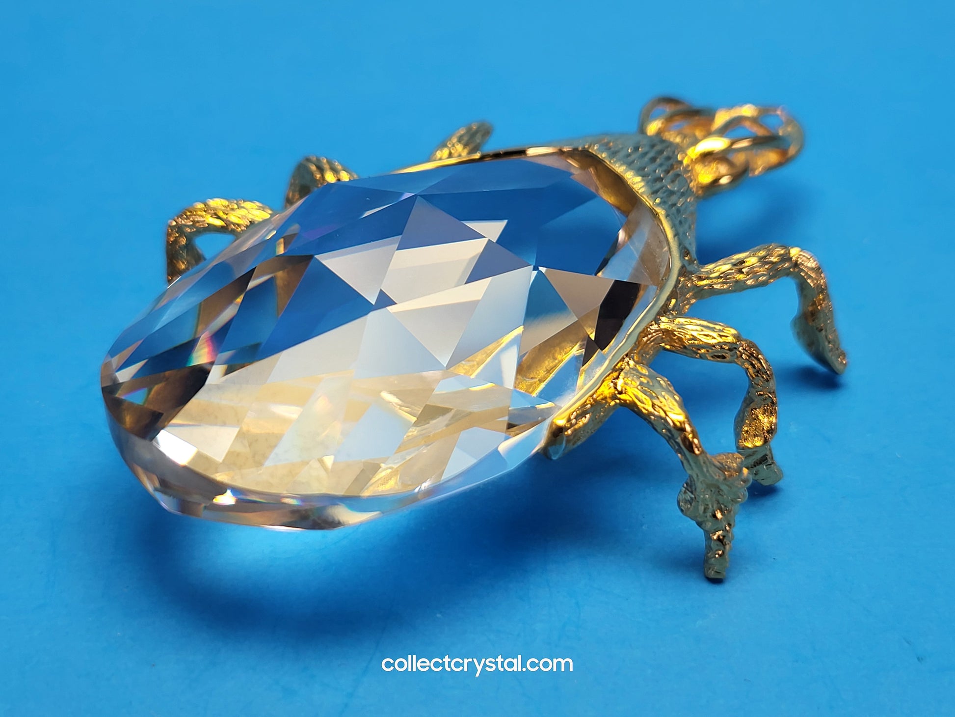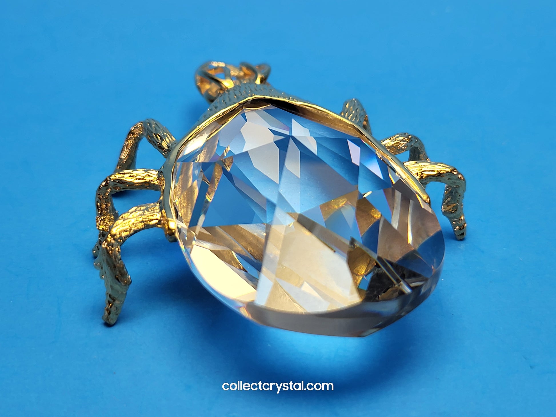 This is the retired Swarovski crystal gold beetle bottle opener which has a smooth finish to the metal. The crystal stone which makes up the main body of the beetle is not interchangeable between var 1 and var 2 of the design. The easy way to tell the variations apart is to look at the metal finish where the legs join the body. Var 1 has a smooth finish, while var 2 is rougher/hairier.