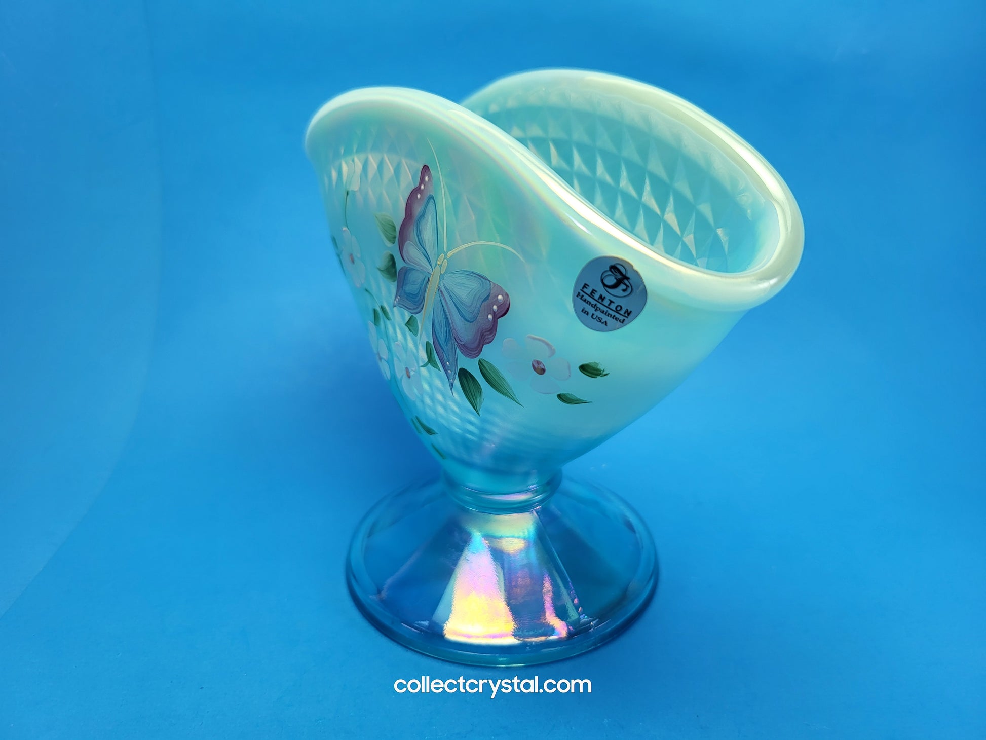 This exquisite Fenton vase showcases the artistry of hand-painter J.L. Dowler, featuring delicate floral and butterfly motifs rendered in vibrant detail. Standing 7.5 inches tall, the piece displays Fenton's signature aqua blue opal glass with mesmerizing iridescent qualities that shift and shimmer in changing light. The elegant fan shape provides classic appeal, while the hand-painted design elevates it to collectible status. Originally offered through QVC, this vintage piece represents quality American glasswork and makes a distinguished addition to any crystal or art glass collection.