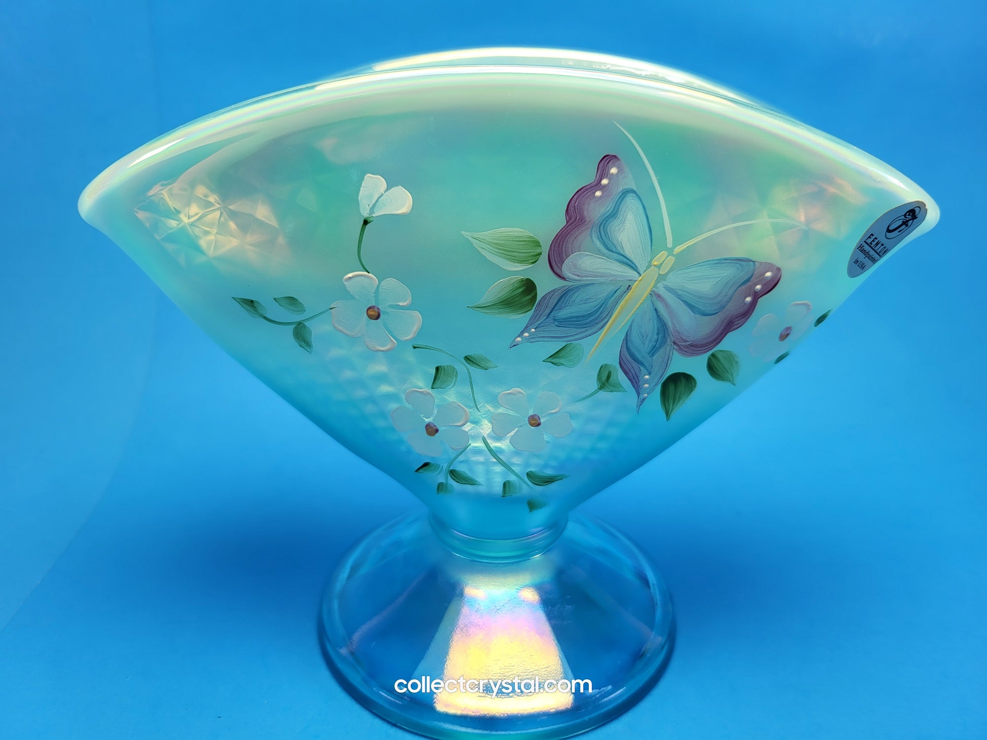 Fenton Aqua Blue Opal Iridescent Floral Butterfly Fan QVC Vase HP J.L. Dowler 7.5"