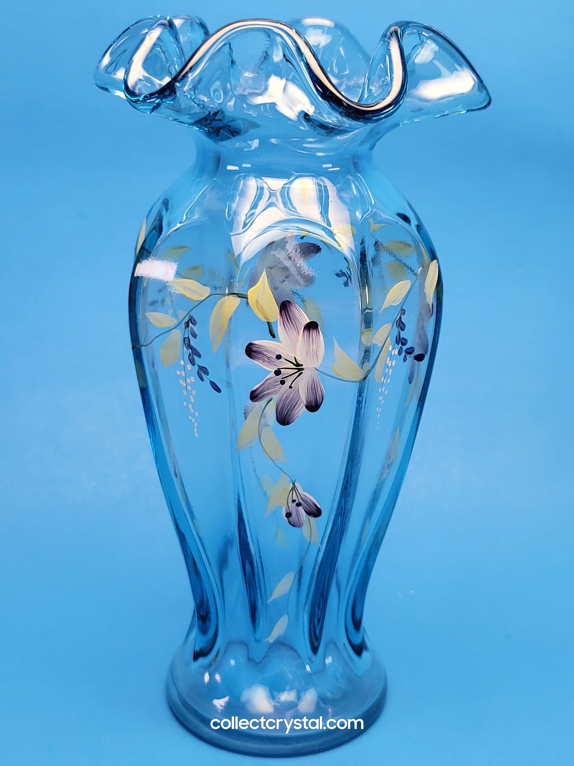 Fenton Blue Ruffled Vase Hand Painted by V. Williams