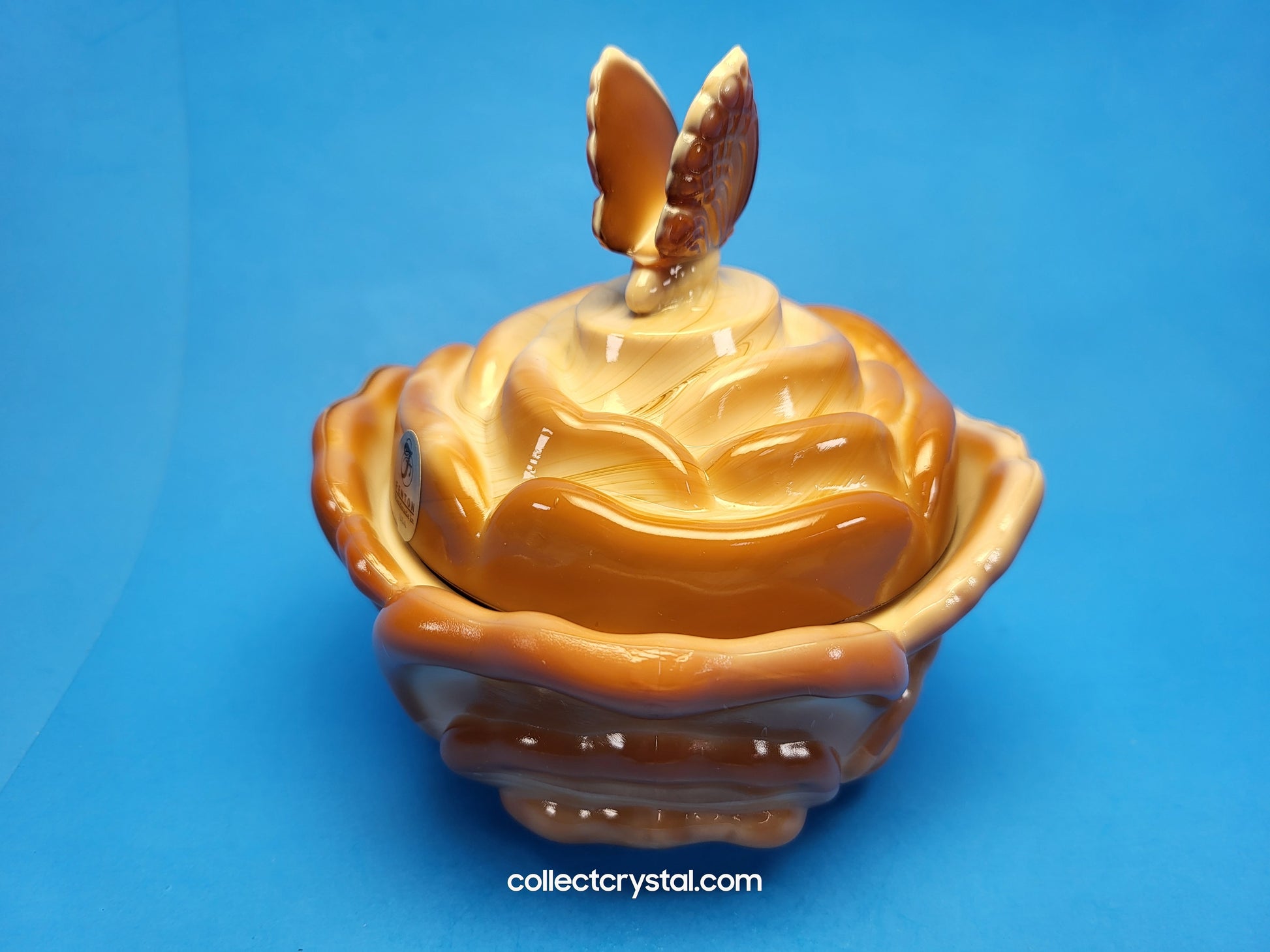 This exquisite Fenton chocolate slag bon bon dish showcases the artistry of American glassmaking at its finest. The rich, swirled chocolate and cream coloring characteristic of slag glass creates a sophisticated visual appeal, while the delicate rose petal motif adds botanical elegance. The crowning butterfly finial lid transforms this piece into a functional work of art—perfect for displaying confections, jewelry, or treasured collectibles. An ideal addition for serious glass collectors and those who appreciate vintage decorative tableware with authentic craftsmanship and timeless charm.