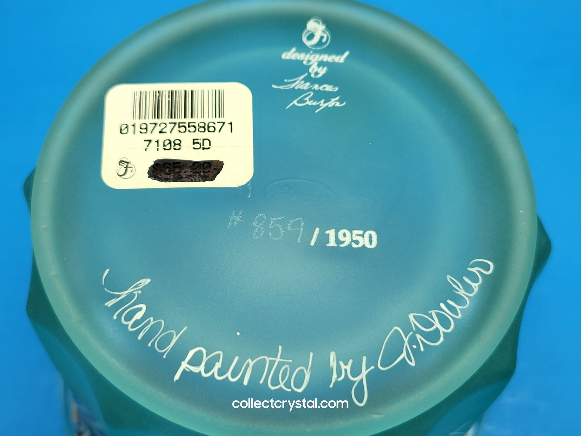 Fenton's Designer Showcase collection presents this exceptional green candy dish with lid, crafted by renowned artist Frances Burton. This limited edition piece, numbered 859 of 1950, exemplifies the artistry and quality Fenton is celebrated for. The elegant green glass features refined proportions ideal for displaying confections or serving as a striking decorative accent. A sought-after collectible for Fenton enthusiasts and art glass aficionados, this numbered edition combines functional design with artistic merit, making it a distinguished addition to any curated collection.