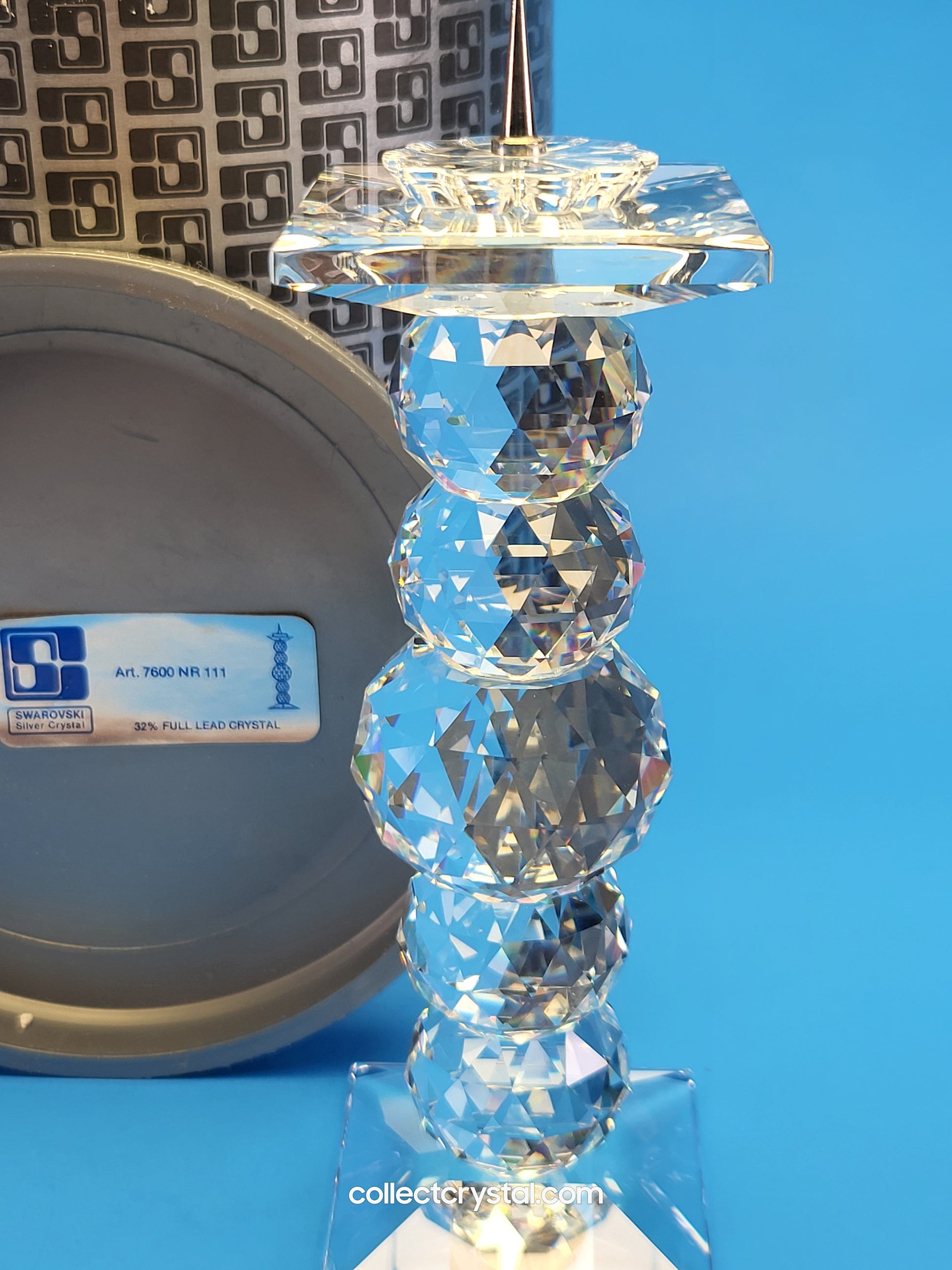 This retired Swarovski crystal candleholder was made for the European market in the pin style and is designed to hold one candle.
