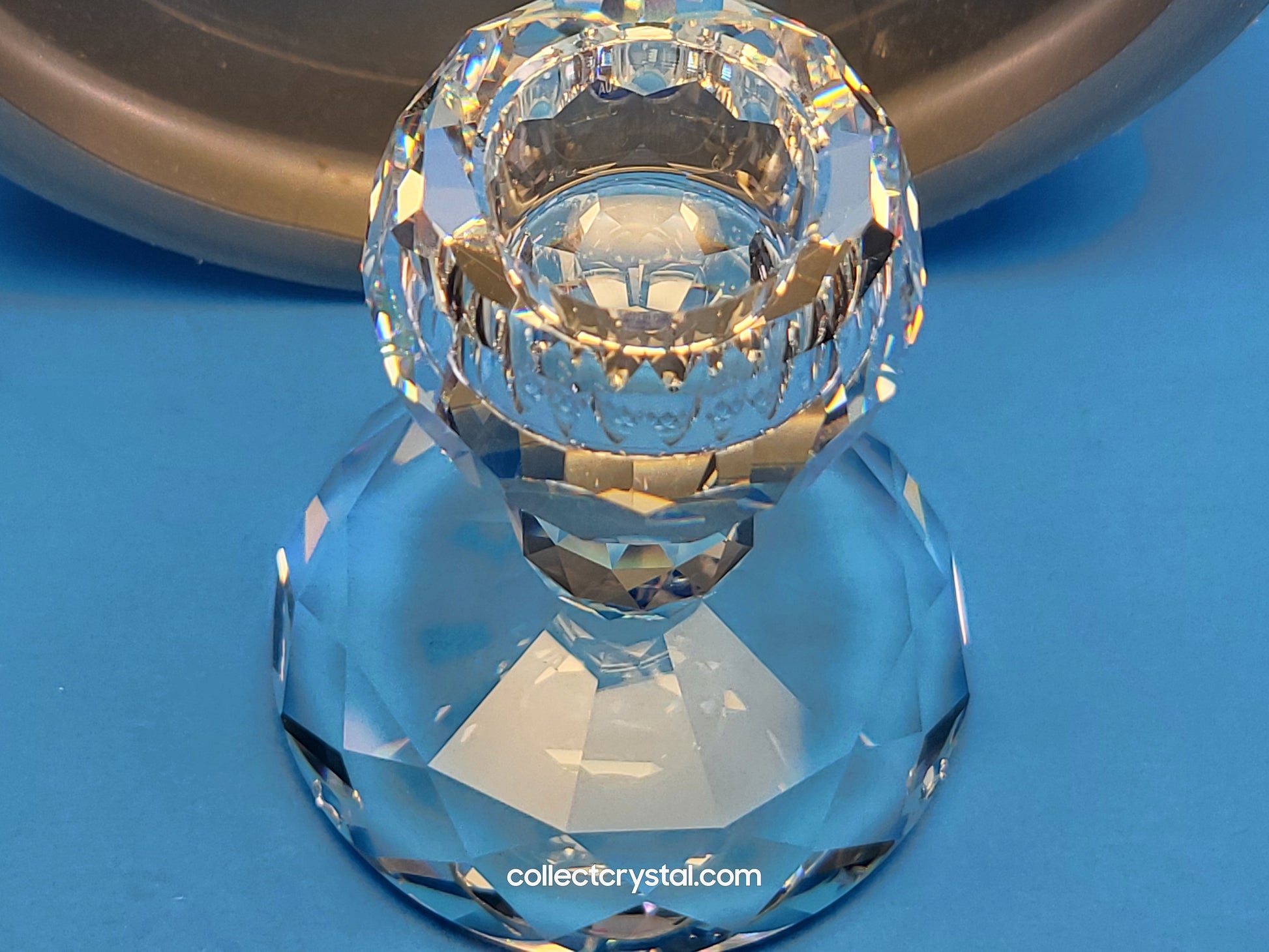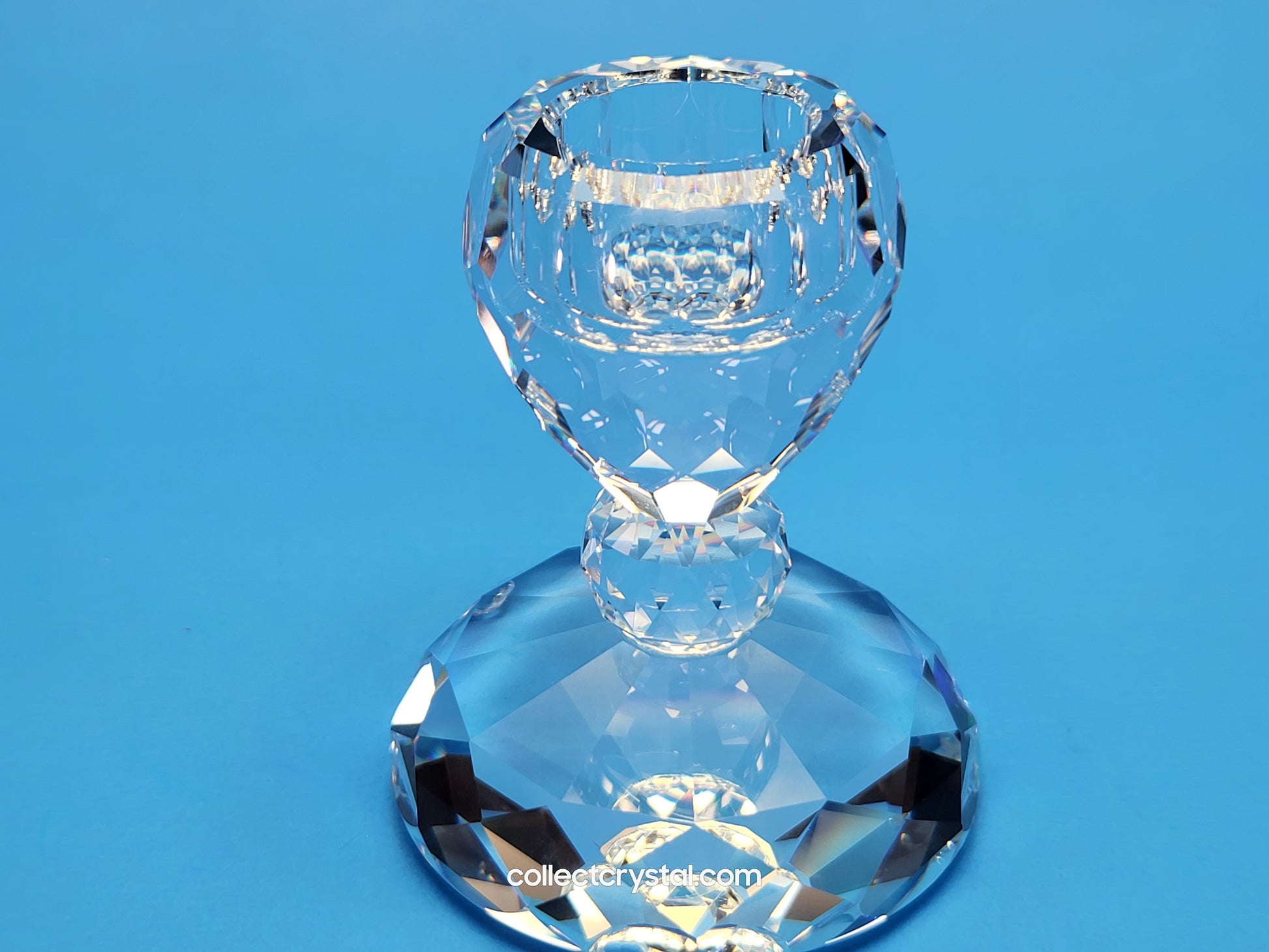 This retired Swarovski crystal candleholder was made for the USA and Canadian market in the hole/cup style and is designed to hold one candle. There are two versions of the cup, as reflected in the photo. One is curved at the top, the other has a flat cut top.