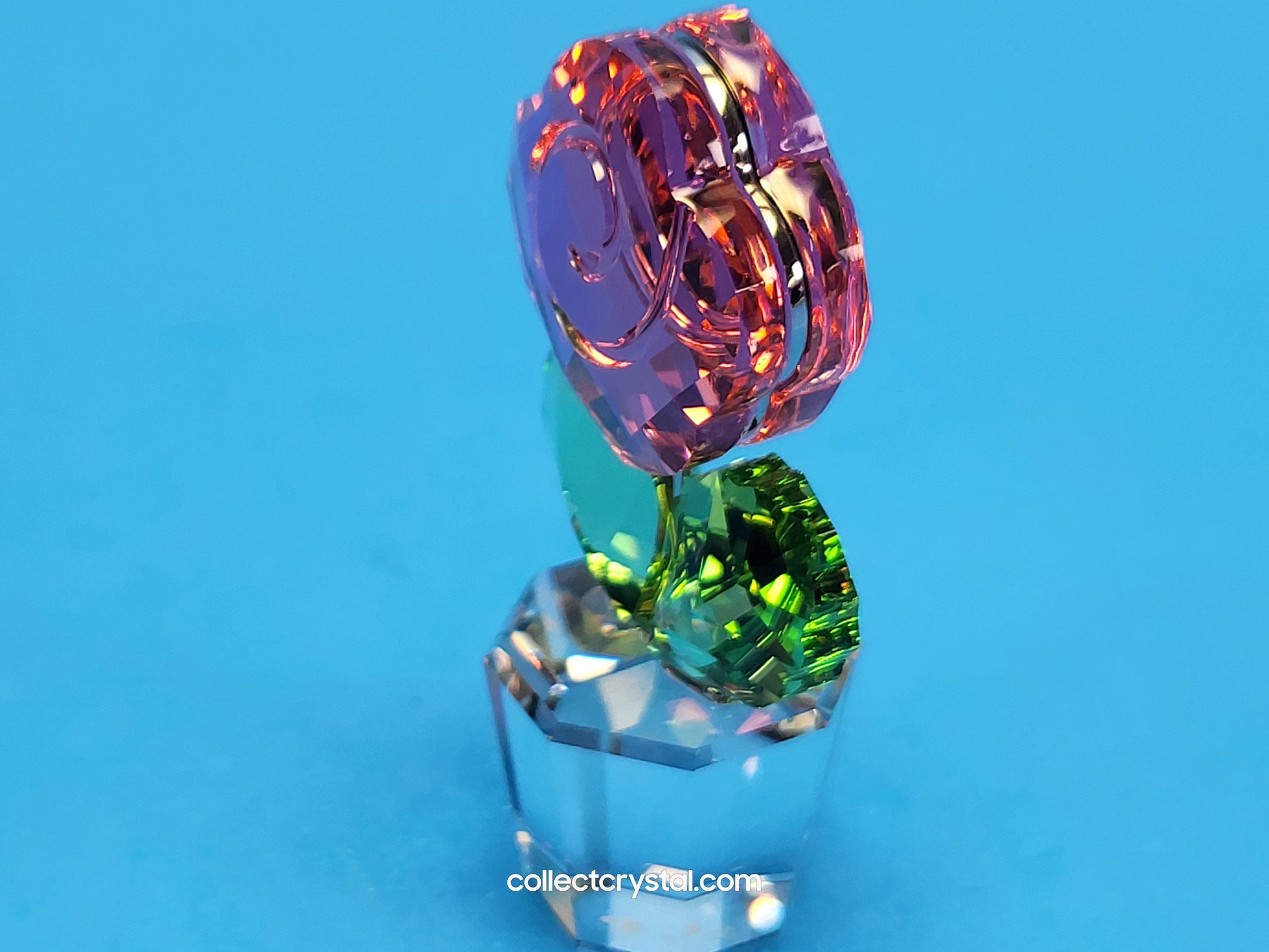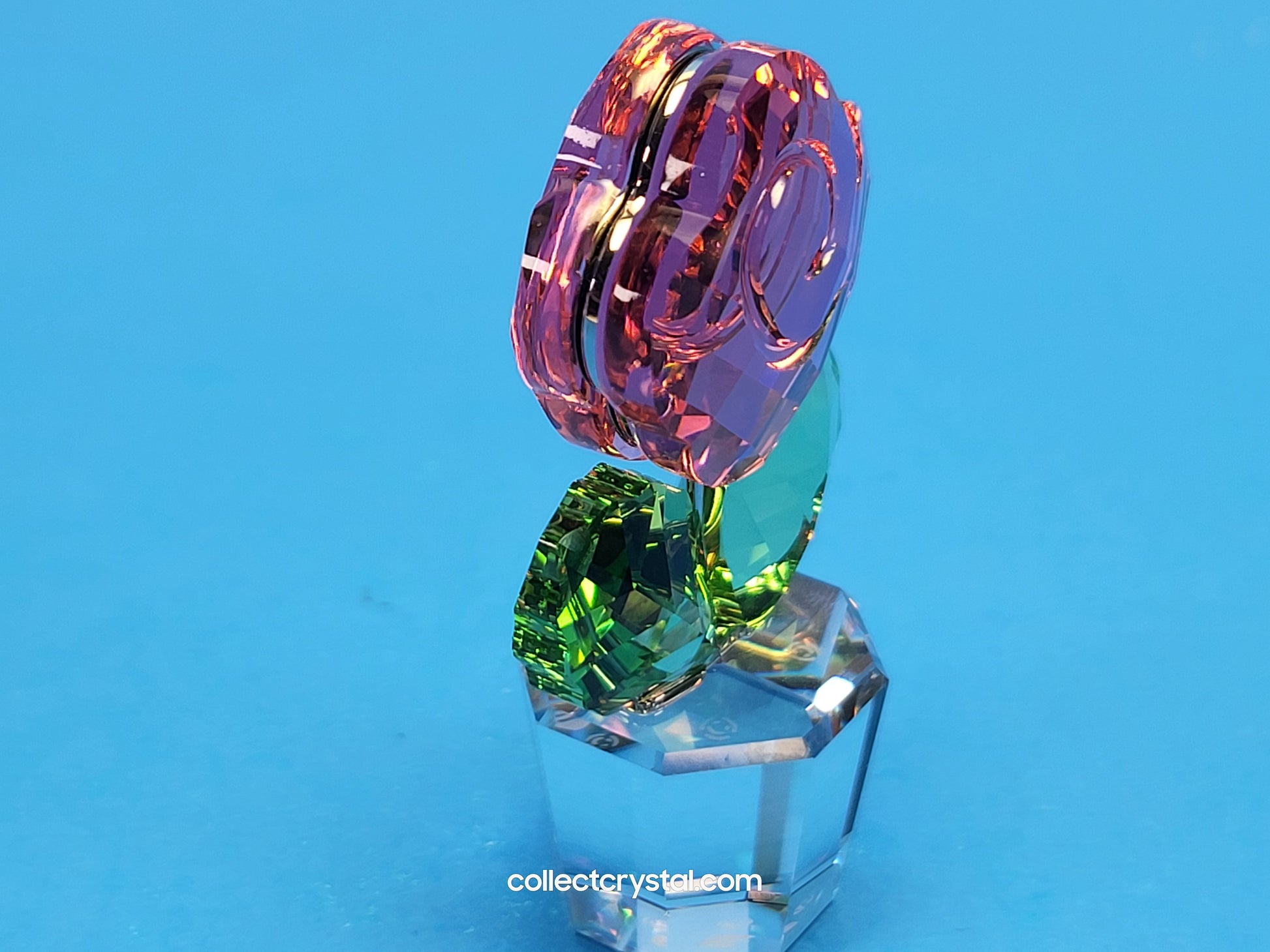 This retired Swarovski Crystal Moments pink rose was part of the “Happy flowers” group. It features a clear pot, peridot (green) leaves and a pink crystal rose.