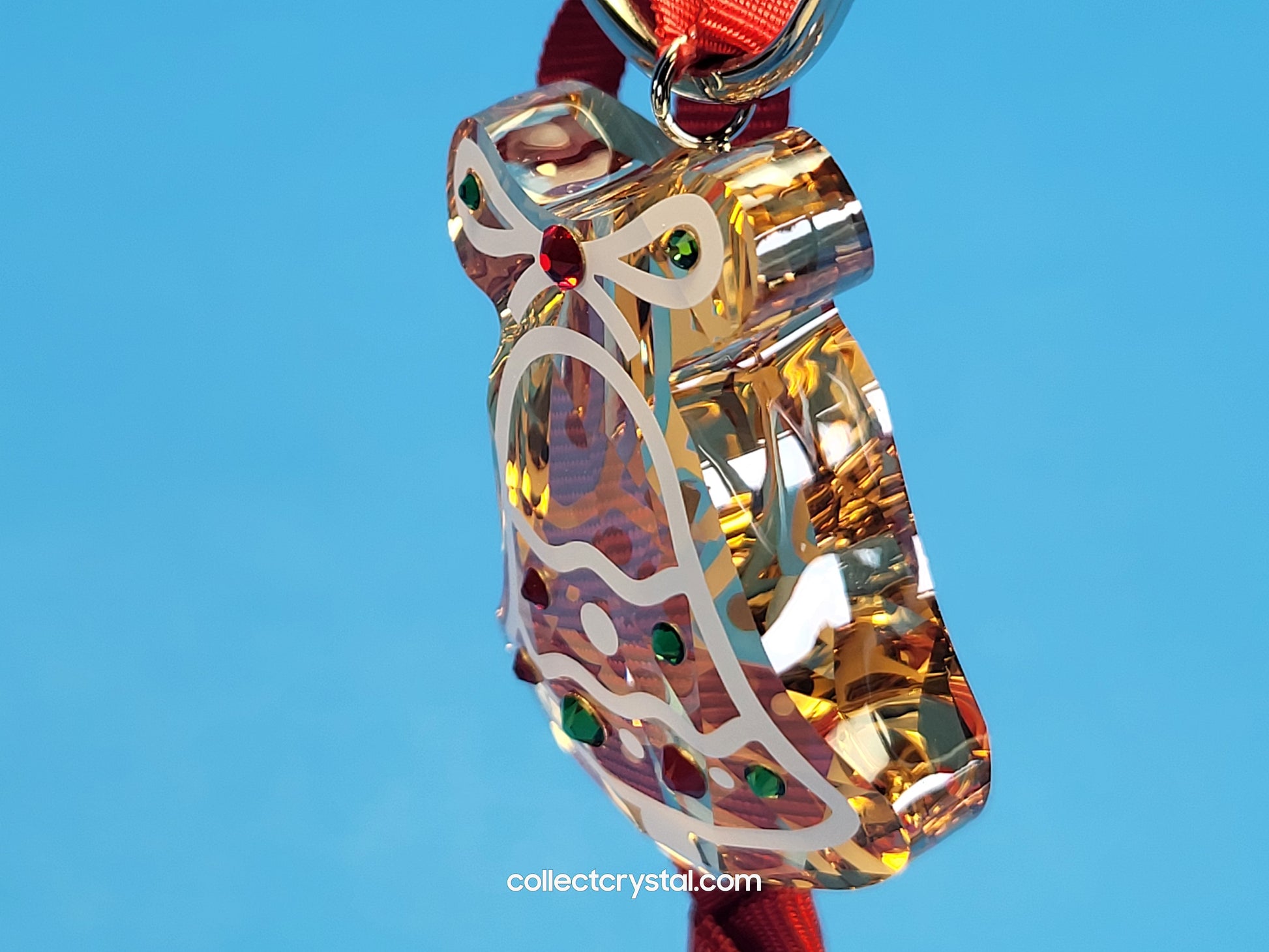 Crafted in a cookie-cut style, this delightful gingerbread ornament exudes charm. Shaped like a festive bell, the piece has a golden glow with 182 light-catching facets. Additional flatbacks and printed frosting elevate the design’s refinement and radiance while evoking tradition. An ideal gift, the piece is suspended from a red grosgrain ribbon and is a joyful celebration of one of the season’s favourite sweet treats.