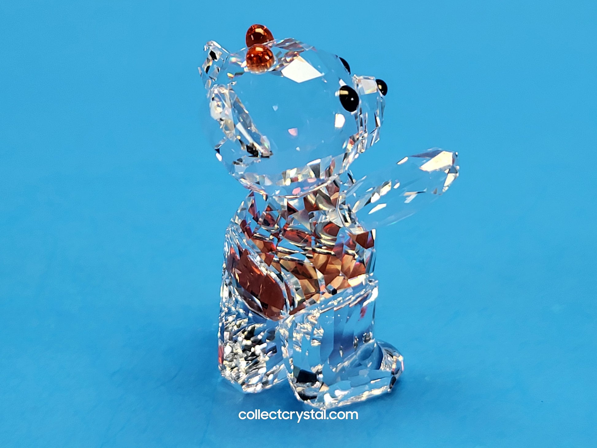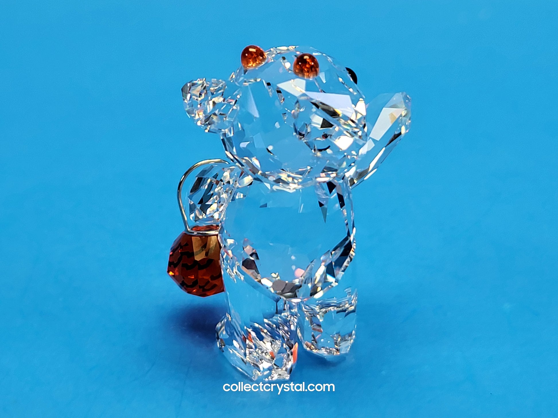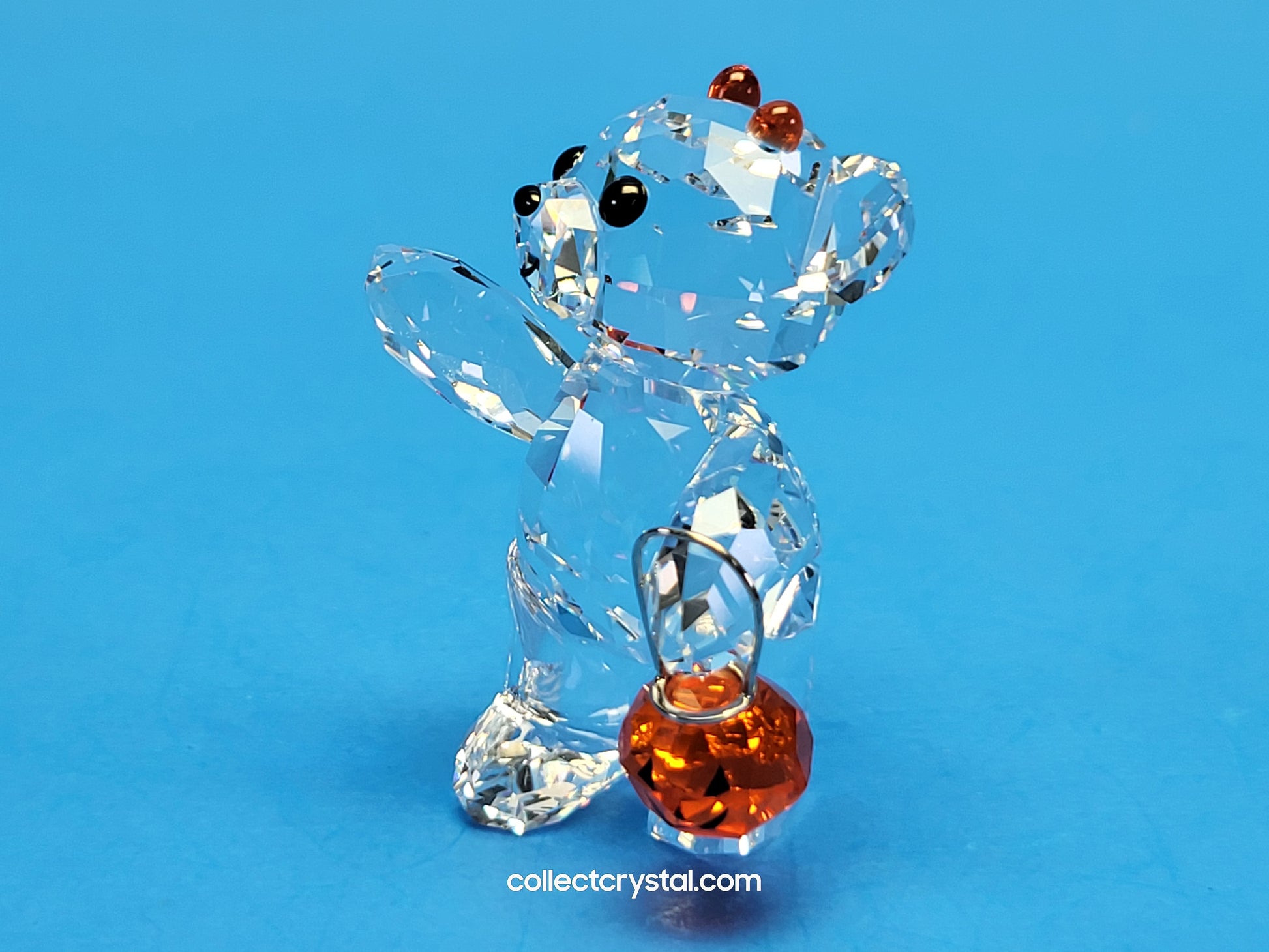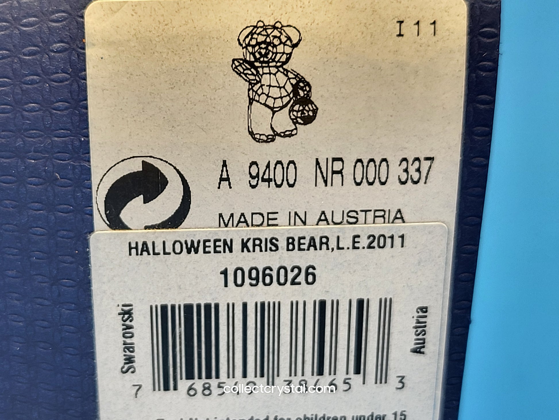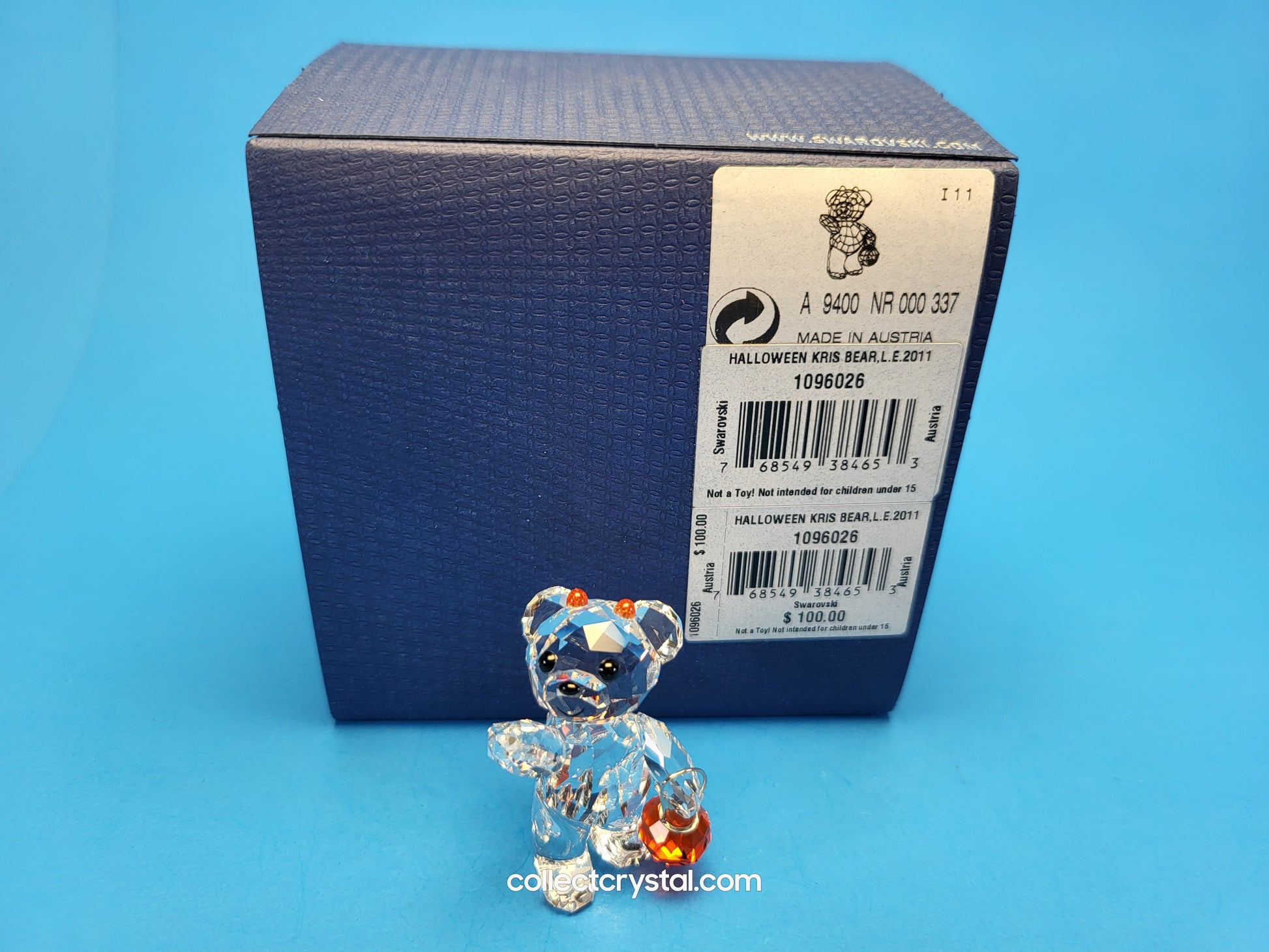 This retired Swarovski crystal Halloween Kris Bear was a limited edition piece for 2011. Trick or treat! This cute little fellow joins the popular Kris Bear family right on time for Halloween 2011. Sparkling mischievously in clear crystal, Halloween Kris Bear carries a vibrant Red Topaz crystal pumpkin lantern with a silver-tone metal handle.