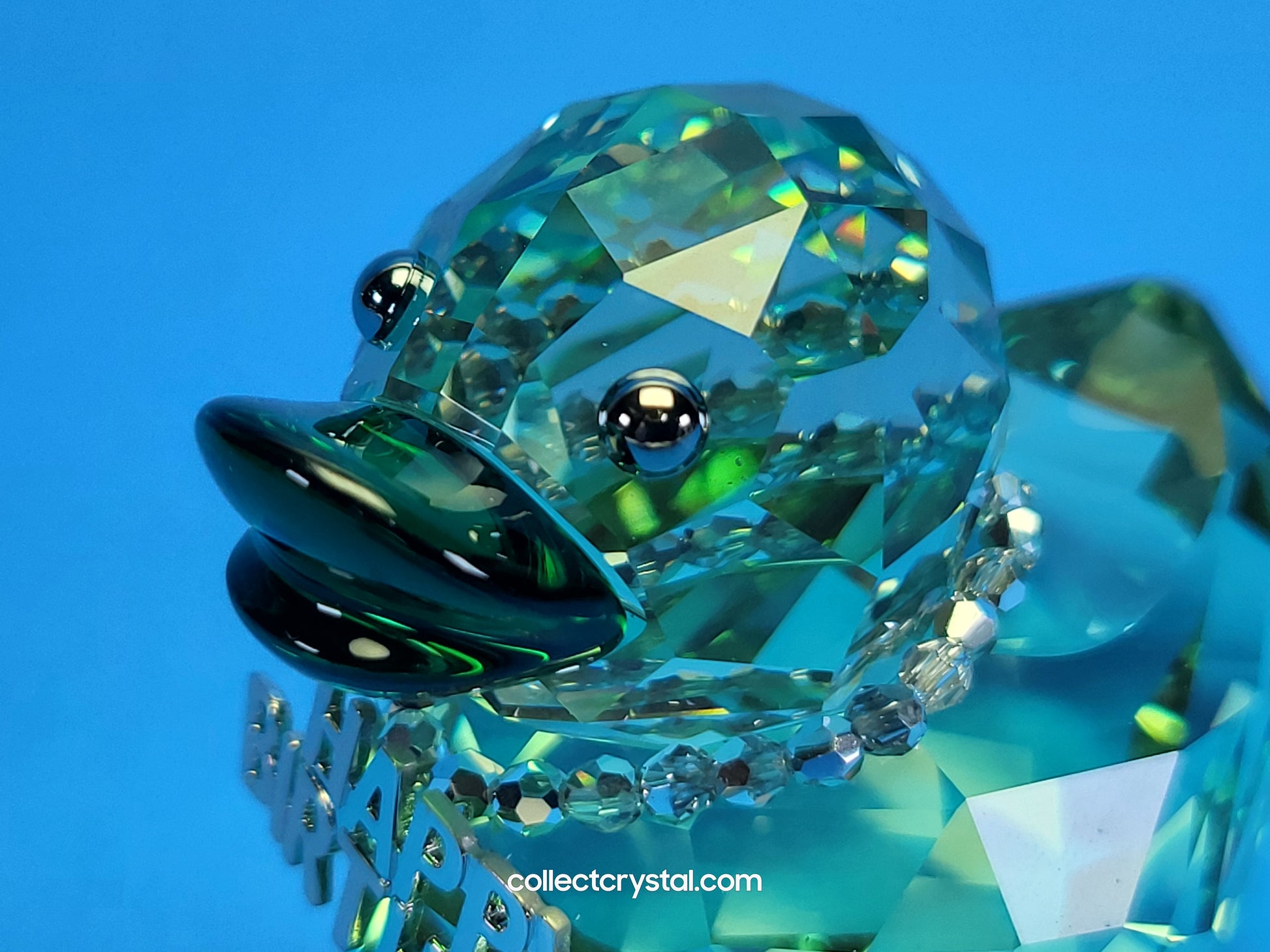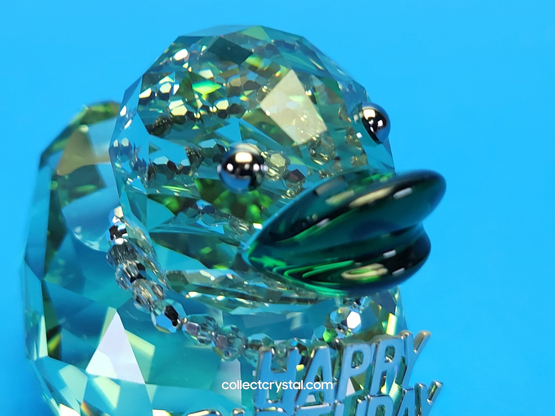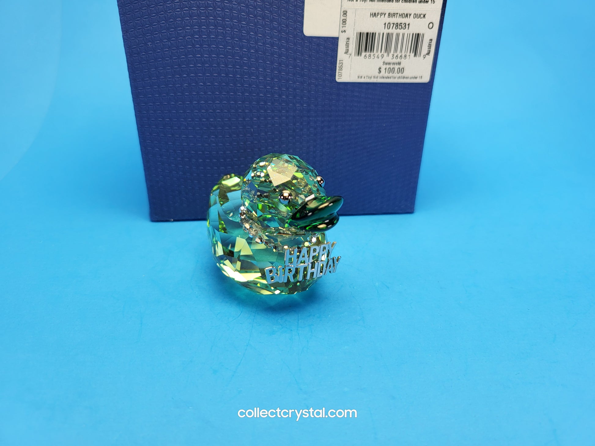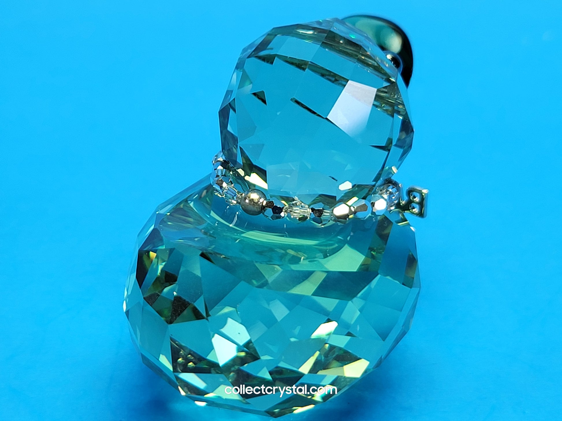 This retired Swarovski Happy Birthday Duck was part of the “Happy Ducks” family. The perfect way to wish someone a happy birthday! This cool medium-sized duck in Erinite crystal joins the popular Happy Ducks family and makes a charming and original birthday gift for men and women alike. The removable necklace with Comet Argent Light crystal beads adds a fun, eye-catching touch.