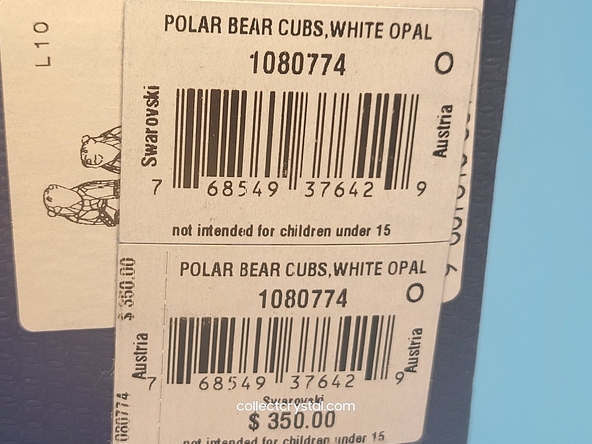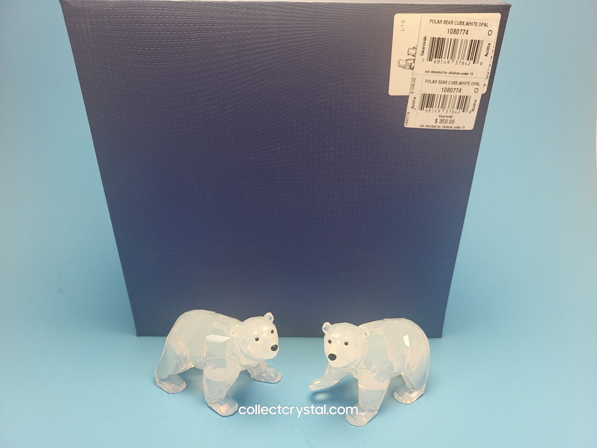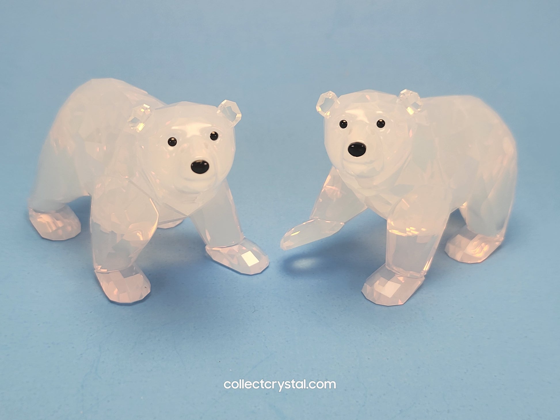 This pair of retired Polar Bear cubs were only available in 2011 and were designed to be displayed with the annual edition Polar Bear “Siku”. The 2 polar bear cubs are made from white opal colour crystal with jet eyes and noses. They are packaged in one box together and were sold separately from the annual edition. The cubs were produced in this colour as polar bear cubs are often a different colour from their mother. Identical shape/size cubs were produced in Crystal Moonlight crystal, also for display with the annual edition Siku bear.